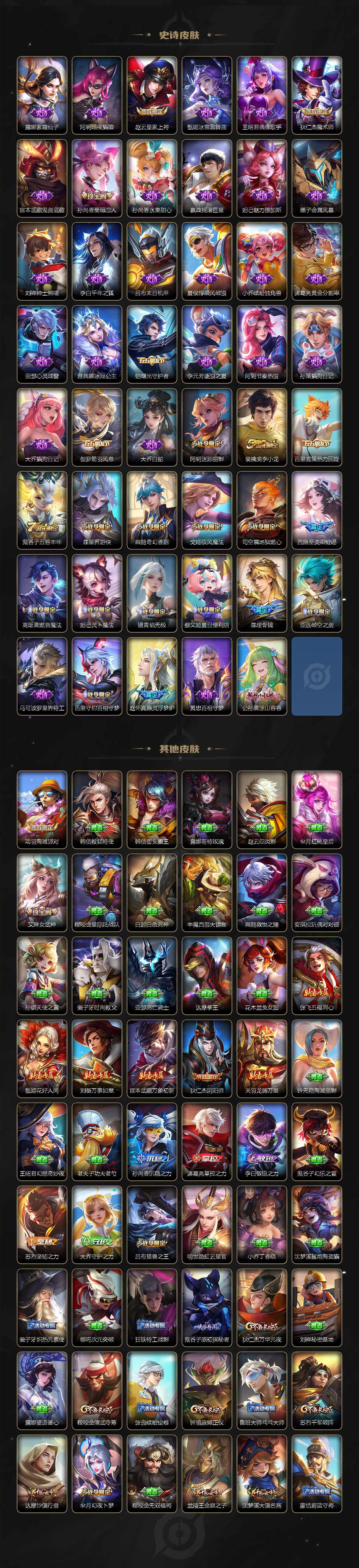 【史诗皮肤】:露娜紫霞仙子,阿轲暗夜猫娘,赵云皇家上将,甄姬冰雪圆舞曲,王昭君偶像歌手,狄仁杰魔术师,宫本武藏鬼剑武藏,孙尚香蔷薇恋人,孙尚香水果甜心,嬴政摇滚巨星,妲己魅力维加斯,墨子金属风暴,刘禅绅士熊喵,李白千年之狐,吕布末日机甲,夏侯惇乘风破浪,小乔缤纷独角兽,诸葛亮黄金分割率,亚瑟心灵战警,雅典娜冰冠公主,铠曙光守护者,李元芳逐浪之夏,阿轲节奏热浪,孙策猫狗日记,大乔猫狗日记,伽罗箭羽风息,大乔白蛇,阿轲迷踪丽影,裴擒虎李小龙,百里玄策热力回旋,鬼谷子五谷丰年,暃星界游侠,扁鹊奇幻香