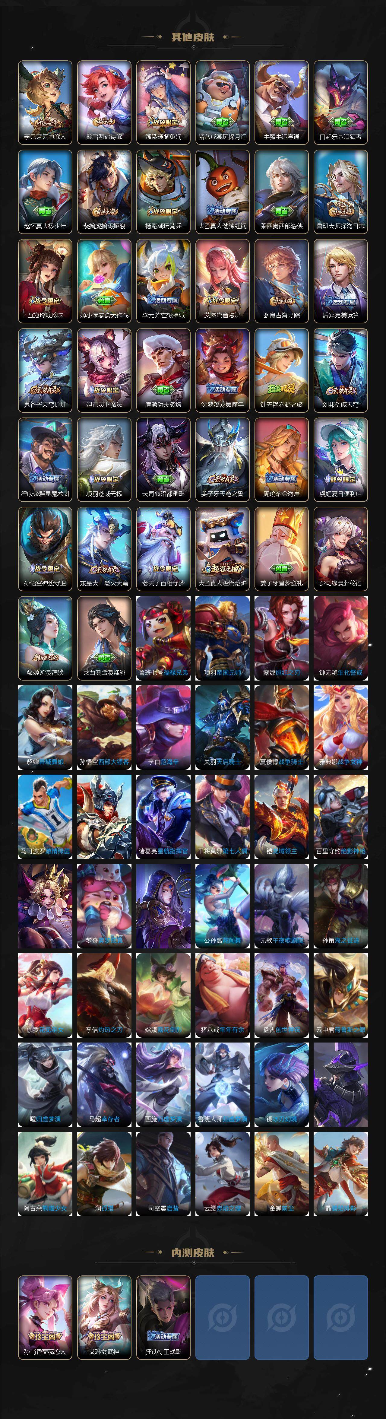 【赛季限定】:狄仁杰万华元夜,达摩沙漠行僧,程咬金演武夺筹,兰陵王金庭之子,张良古海寻踪,李元芳云中旅人,钟馗驱傩正仪,鬼谷子原初探秘者,苏烈千军破阵,沈梦溪大漠名商,裴擒虎擒涛扼浪,鲁班大师探海日志,桑启海盐诗旅,鬼谷子天穹祈灯,刘邦剑破天穹,姜子牙天穹之誓