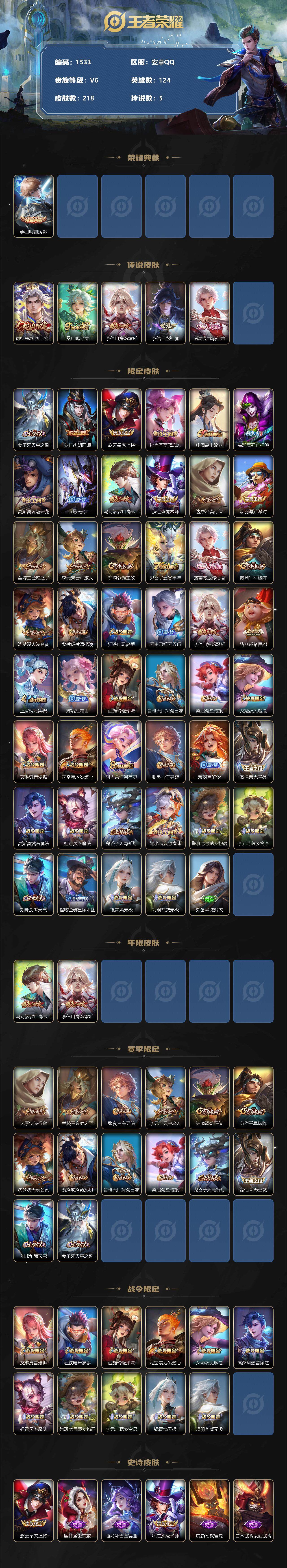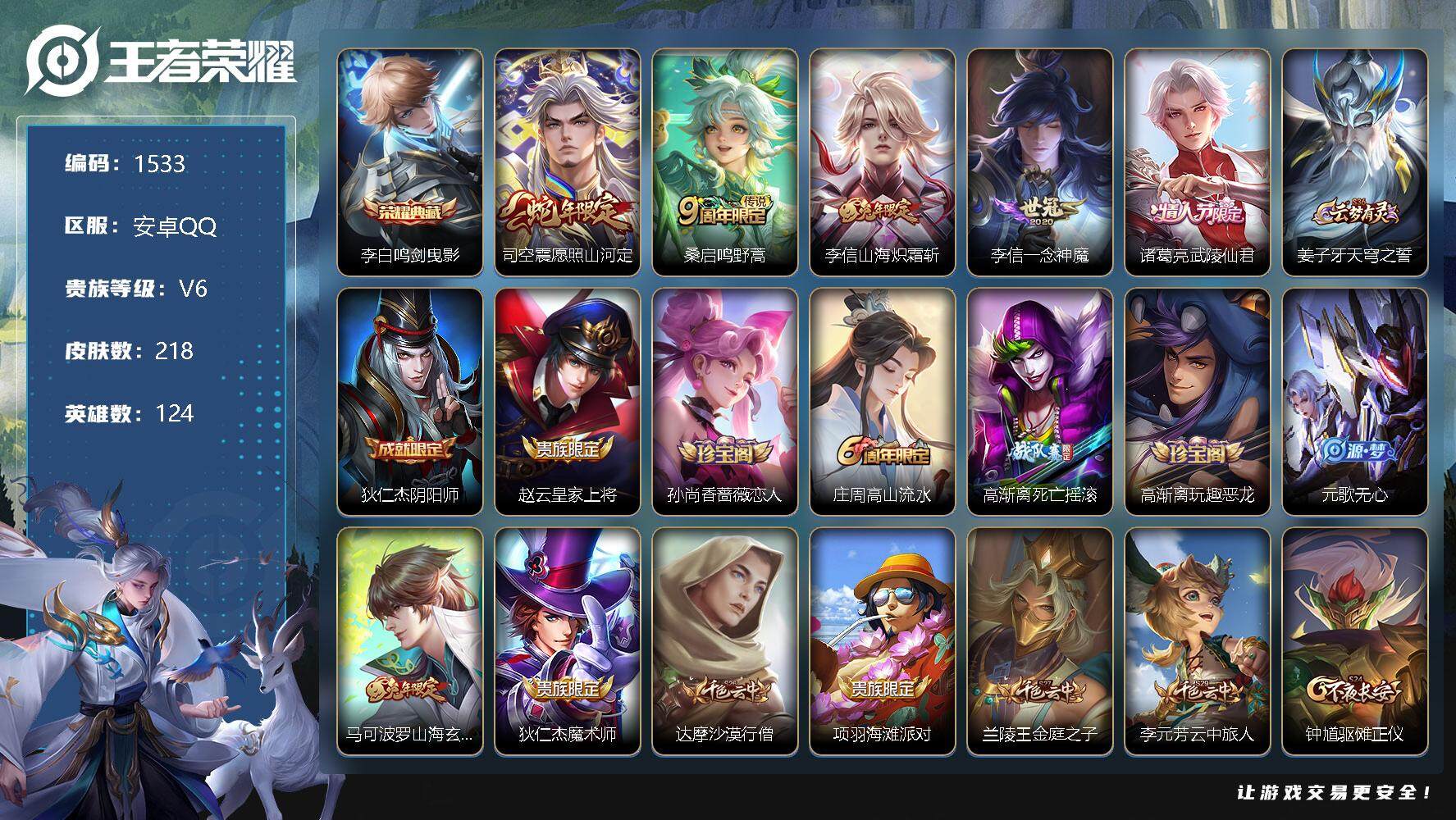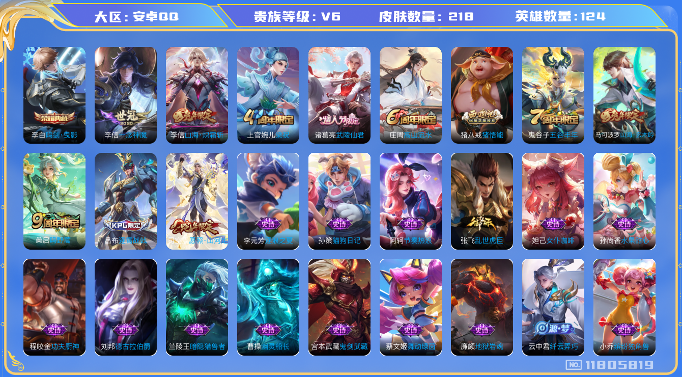 [11805819]【商品标题】:安卓Q-V6-最强王者段位-124英雄-218皮肤-1典藏-0珍品无双-0无双-0珍品传说-5传说-52史诗