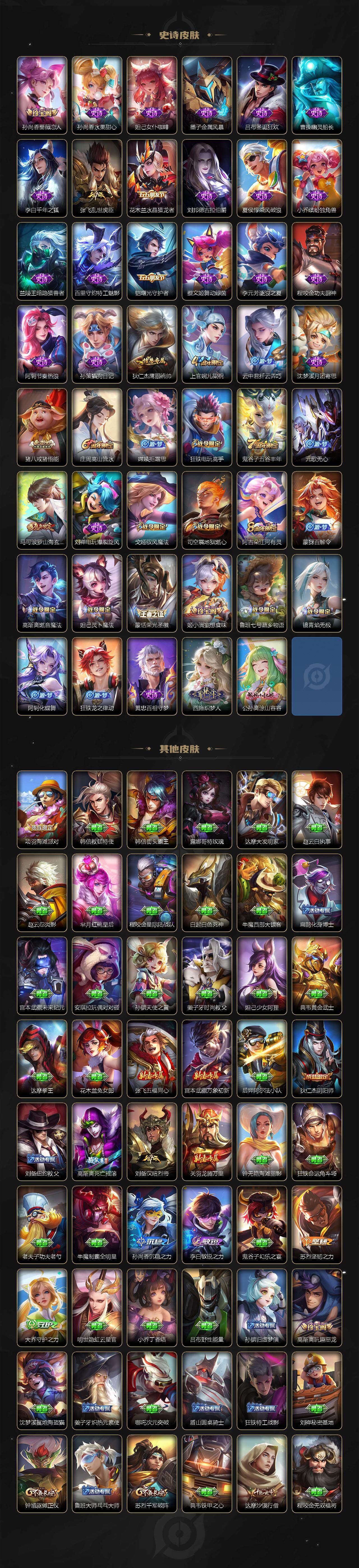 【史诗皮肤】:赵云皇家上将,貂蝉圣诞恋歌,甄姬冰雪圆舞曲,狄仁杰魔术师,廉颇地狱岩魂,宫本武藏鬼剑武藏,孙尚香蔷薇恋人,孙尚香水果甜心,妲己女仆咖啡,墨子金属风暴,吕布圣诞狂欢,曹操幽灵船长,李白千年之狐,张飞乱世虎臣,花木兰水晶猎龙者,刘邦德古拉伯爵,夏侯惇乘风破浪,小乔缤纷独角兽,兰陵王暗隐猎兽者,百里守约特工魅影,铠曙光守护者,蔡文姬舞动绿茵,李元芳逐浪之夏,程咬金功夫厨神,阿轲节奏热浪,孙策猫狗日记,狄仁杰鹰眼统帅,上官婉儿梁祝,云中君纤云弄巧,沈梦溪月团寄思,猪八戒猪悟能,庄周高山流水,嫦娥拒霜思,狂铁电玩高手,鬼谷子五谷丰年,元歌无心,马可波罗山海玄木吟,刘禅电玩爆裂旋