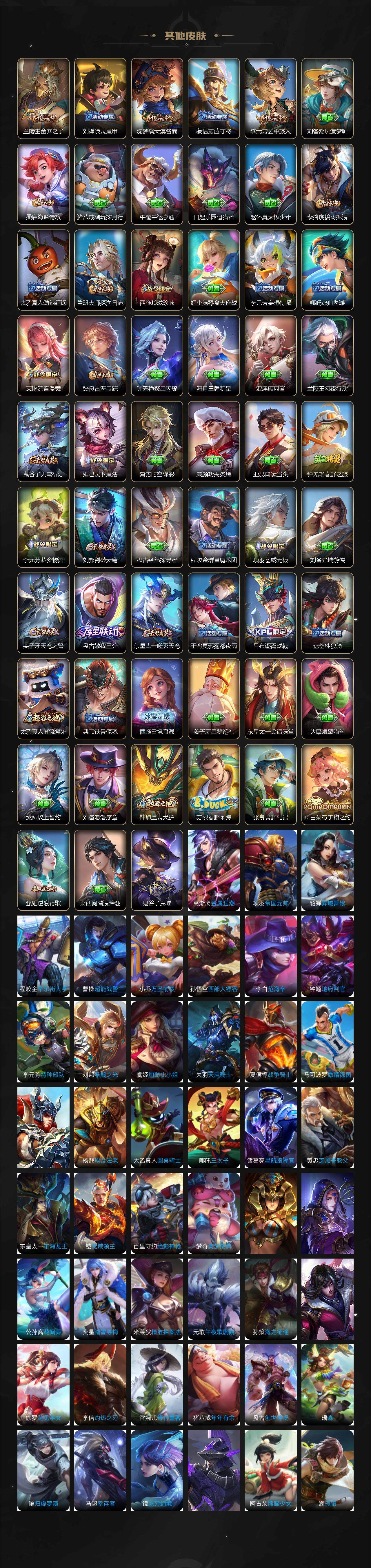 【限定皮肤】:姜子牙天穹之誓,狄仁杰阴阳师,赵云皇家上将,孙尚香蔷薇恋人,庄周高山流水,高渐离死亡摇滚,高渐离玩趣恶龙,元歌无心,马可波罗山海玄木吟,狄仁杰魔术师,达摩沙漠行僧,项羽海滩派对,兰陵王金庭之子,李元芳云中旅人,钟馗驱傩正仪,鬼谷子五谷丰年,诸葛亮武陵仙君,苏烈千军破阵,沈梦溪大漠名商,裴擒虎擒涛扼浪,狂铁电玩高手,云中君纤云弄巧,李信山海炽霜斩,猪八戒猪悟能,上官婉儿梁祝,嫦娥拒霜思,西施玲珑珍味,鲁班大师探海日志,桑启海盐诗旅,戈娅驭风魔法,艾琳流音漫舞,司空震地狱燃心,阿古朵江河有灵,张良古海寻踪,蒙犽百解令,蒙恬荣光圣徽,高渐离燃音魔法,妲己灵卜魔法,鬼谷子天穹祈灯,姬小满妄想食味,鲁班七号蔬乡物语,李元芳蔬乡物语,刘邦剑破天穹,程咬金群星魔术团,镜青焰无极,项羽苍威无极,刘备异域游侠