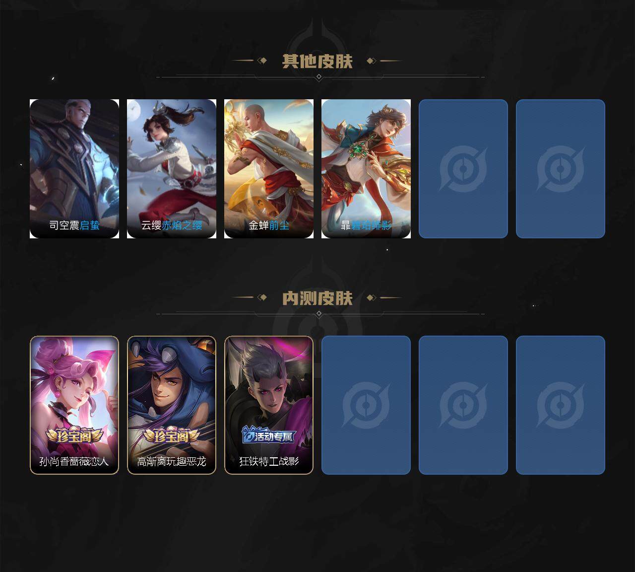 【传说皮肤】:司空震愿照山河定,桑启鸣野蒿,李信山海炽霜斩,李信一念神魔,诸葛亮武陵仙君