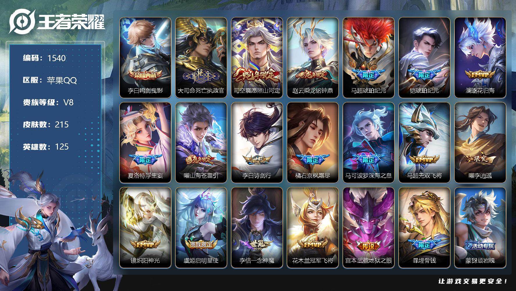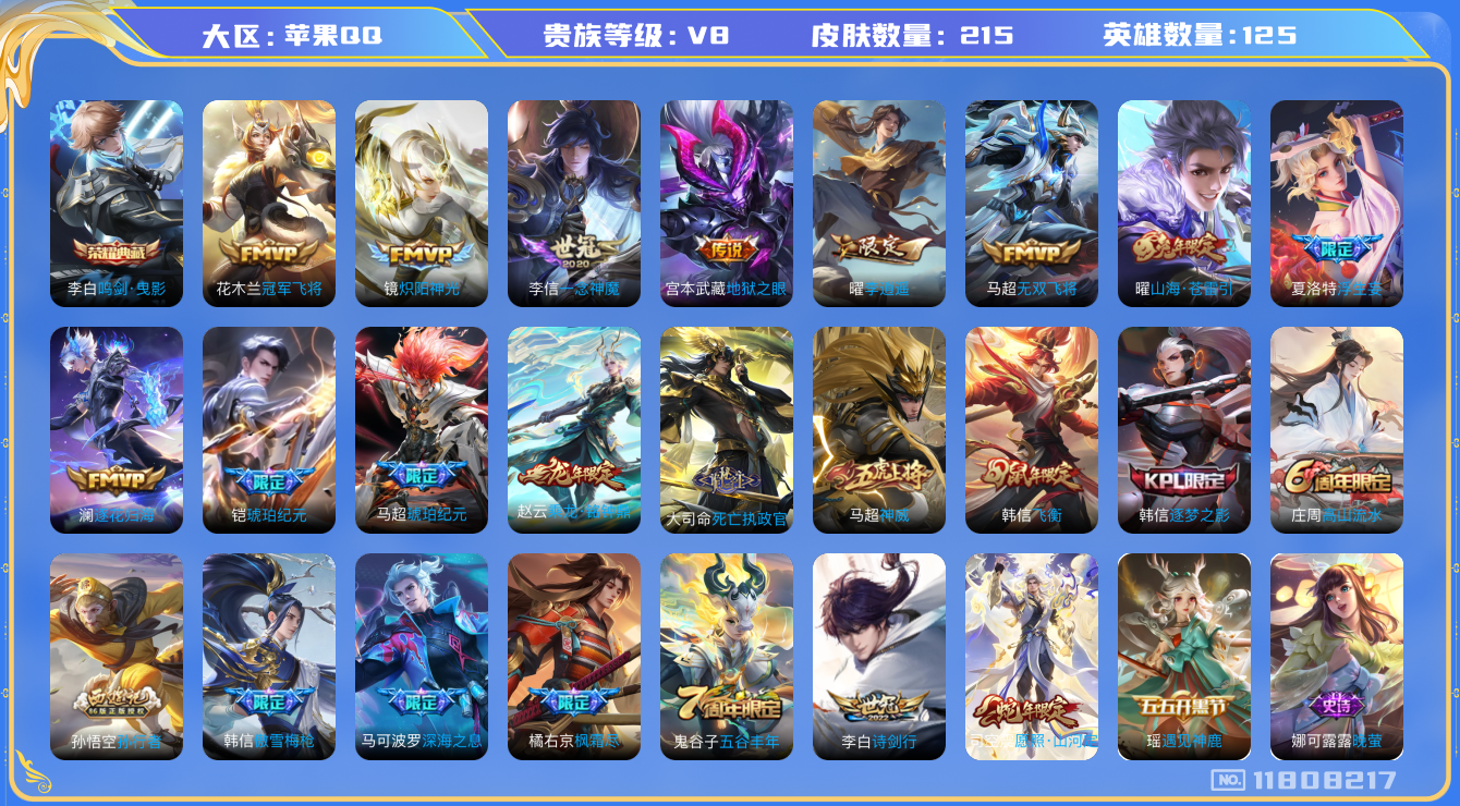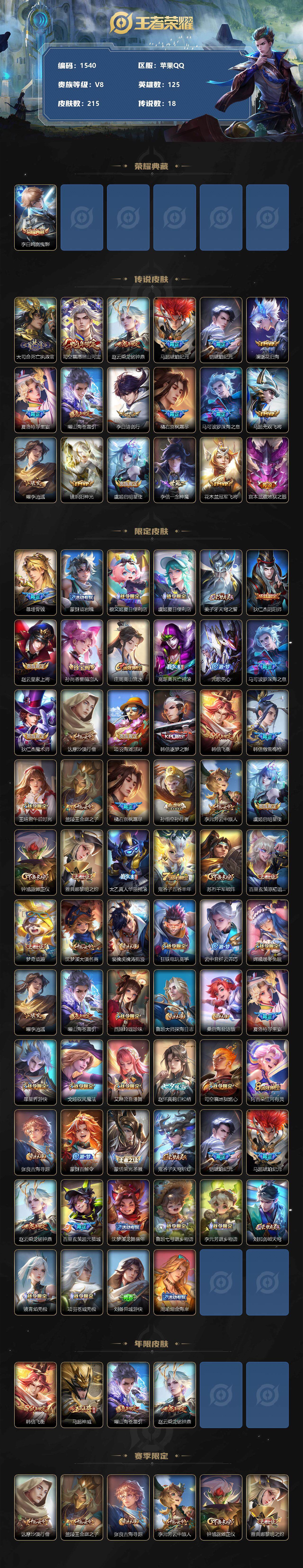 [11808217]【商品标题】:苹果Q-V8-最强王者段位-125英雄-215皮肤-1典藏-0珍品无双-0无双-0珍品传说-18传说-68史诗