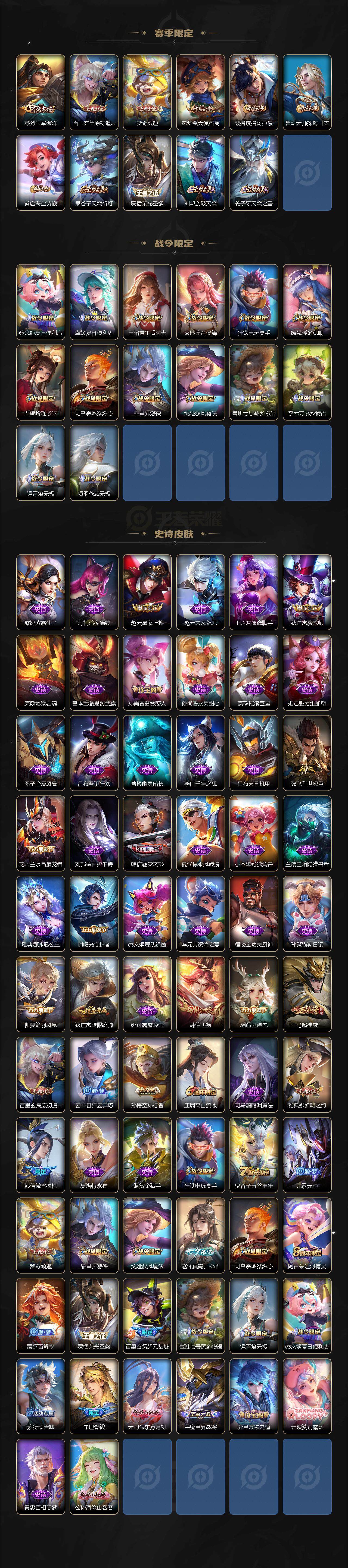 【限定皮肤】:暃埋骨钱,蒙犽顽岩魄,蔡文姬夏日便利店,虞姬夏日便利店,姜子牙天穹之誓,狄仁杰阴阳师,赵云皇家上将,孙尚香蔷薇恋人,庄周高山流水,高渐离死亡摇滚,元歌无心,马可波罗深海之息,狄仁杰魔术师,达摩沙漠行僧,项羽海滩派对,韩信逐梦之影,韩信飞衡,韩信傲雪梅枪,王昭君午后时光,兰陵王金庭之子,橘右京枫霜尽,孙悟空孙行者,李元芳云中旅人,虞姬启明星使,钟馗驱傩正仪,雅典娜黎明之约,太乙真人华丽摇滚,鬼谷子五谷丰年,苏烈千军破阵,百里玄策原初追逐者,梦奇顽趣,沈梦溪大漠名商,裴擒虎擒涛扼浪,狂铁电玩高手,云中君纤云弄巧,嫦娥暖冬兔眠,曜李逍遥 ,曜山海苍雷引,西施玲珑珍味,鲁班大师探海日志,桑启海盐诗旅,夏洛特浮生妄,暃星界游侠,戈娅驭风魔法,艾琳流音漫舞,赵怀真鹤归松栖,司空震地狱燃心,阿古朵江河有灵,张良古海寻踪,蒙犽百解令,蒙恬荣光圣徽,鬼谷子天穹祈灯,铠琥珀纪元,马超琥珀纪元,赵云乘龙铭钟鼎,百里玄策超元猎域,沈梦溪龙舞盛年,鲁班七号蔬乡物语,李元芳蔬乡物语,刘邦剑破天穹,镜青焰无极,项羽苍威无极,刘备异域游侠,周瑜熔金海岸