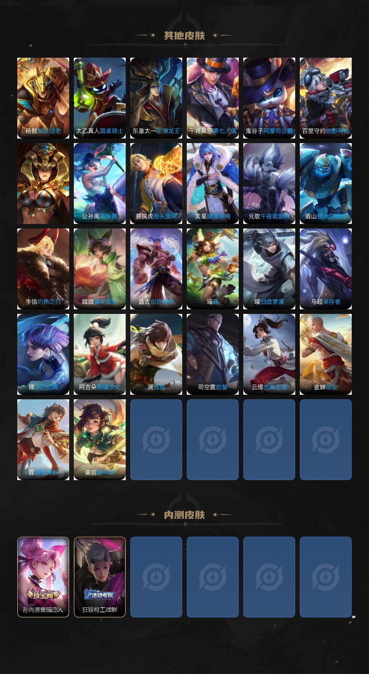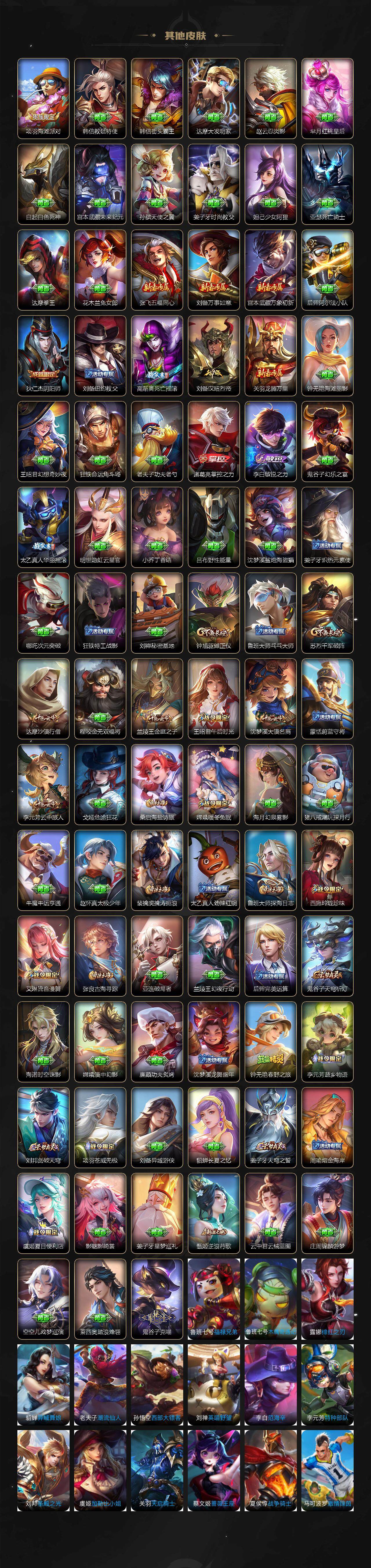 瑶遇见神鹿,娜可露露晚萤,伽罗箭羽风息,李元芳逐浪之夏,孙策猫狗日记,露娜紫霞仙子,王昭君偶像歌手,阿轲暗夜猫娘,雅典娜冰冠公主,吕布末日机甲,嬴政摇滚巨星,程咬金功夫厨神,刘邦德古拉伯爵,兰陵王暗隐猎兽者,曹操幽灵船长,宫本武藏鬼剑武藏,司马懿暗渊魔法,蔡文姬舞动绿茵,廉颇地狱岩魂,小乔缤纷独角兽,夏侯惇乘风破浪,花木兰水晶猎龙者,铠曙光守护者,墨子金属风暴,百里玄策原初追逐者,吕布圣诞狂欢,雅典娜黎明之约,李白千年之狐,夏洛特永昼,澜赏金猎手,赵怀真鹤归松栖,蒙犽百解令