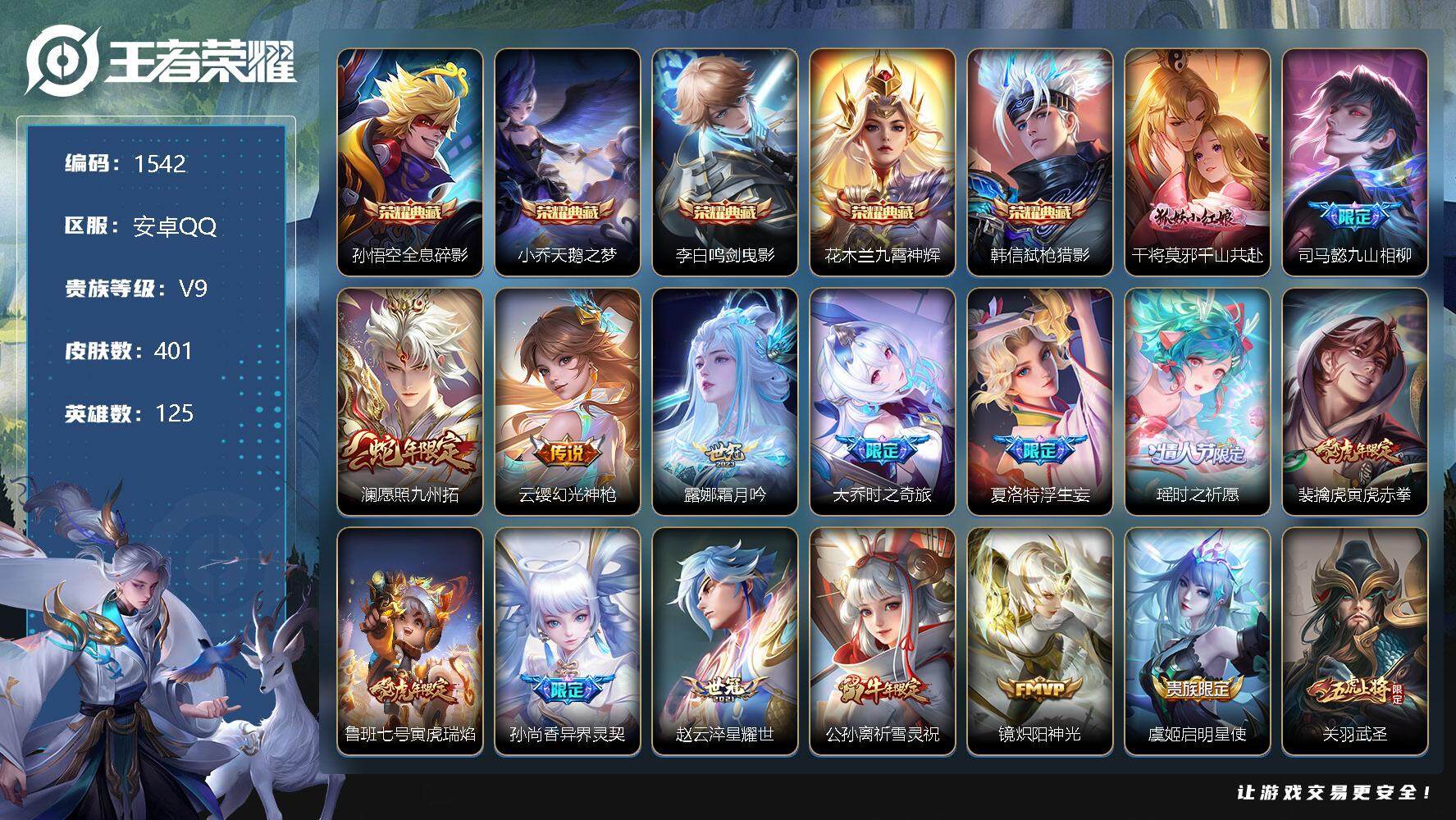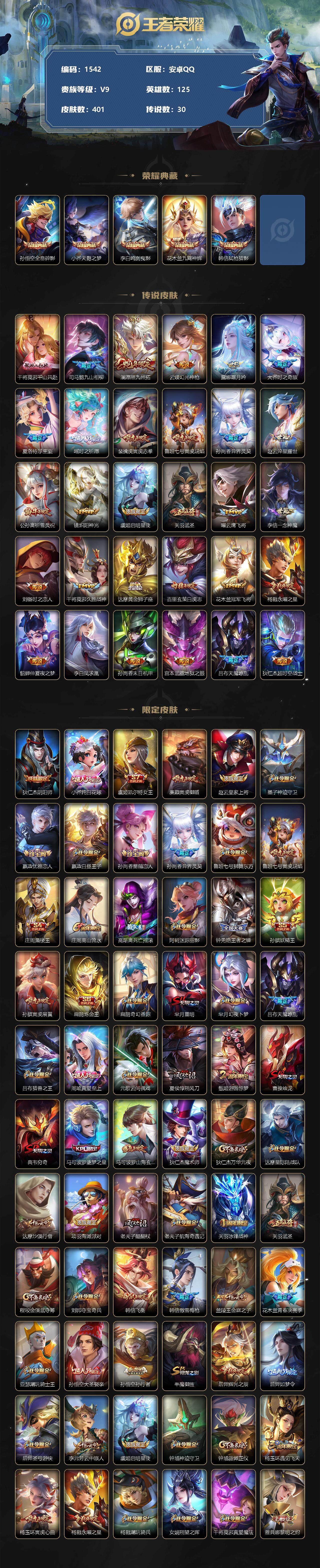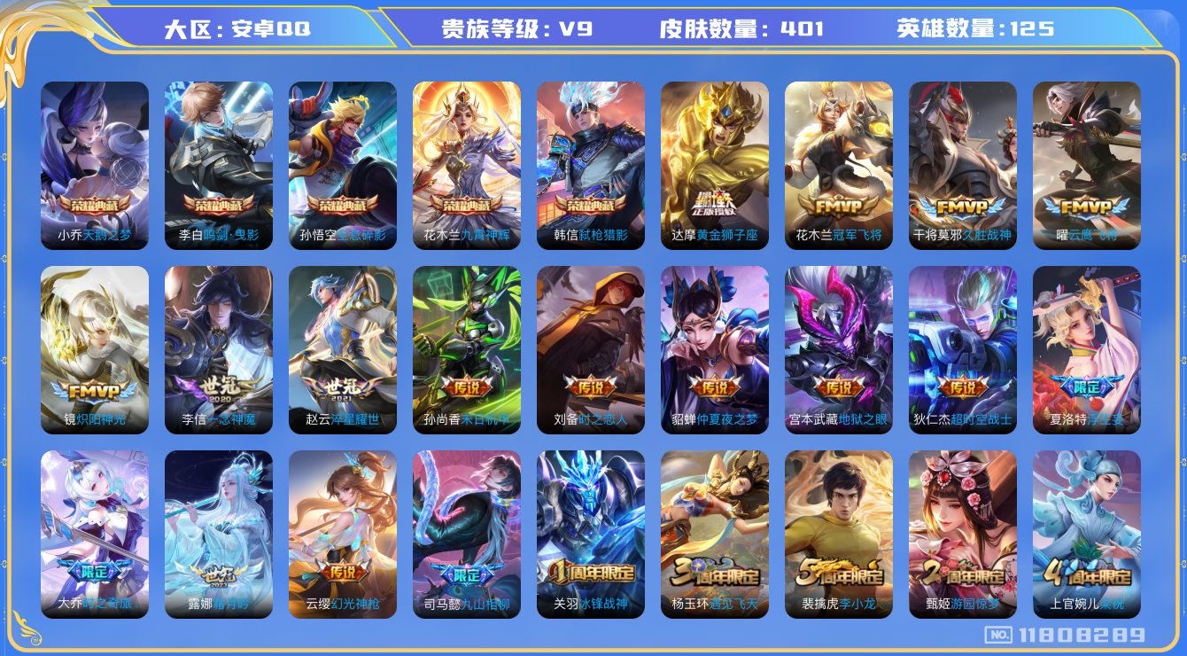 [11808289]【商品标题】:安卓Q-V9-最强王者段位-125英雄-401皮肤-5典藏-0珍品无双-0无双-0珍品传说-30传说-124史诗