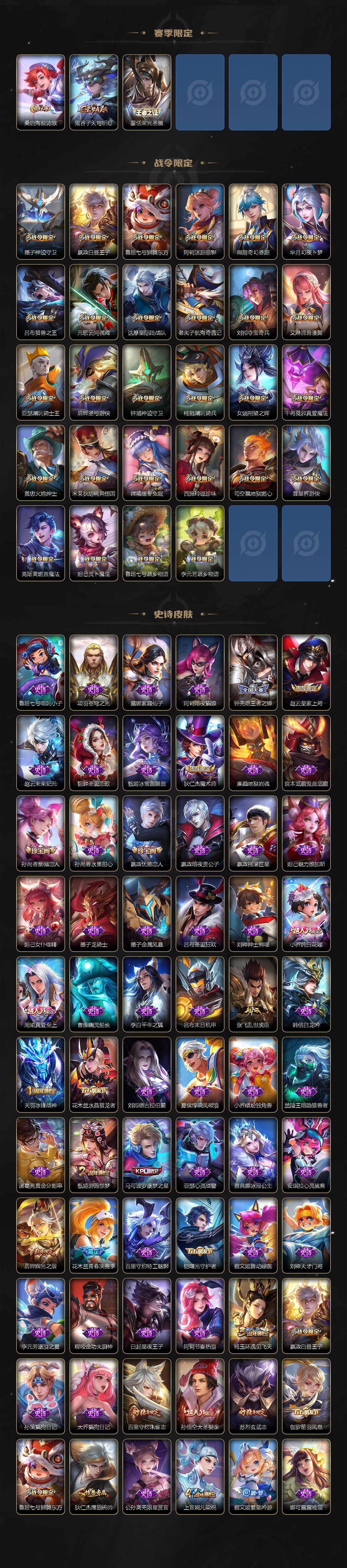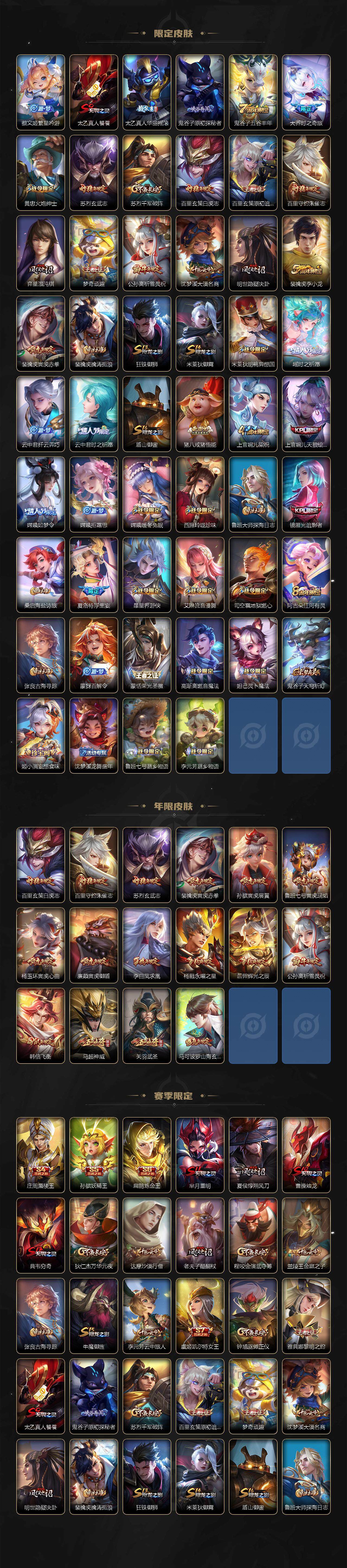 【限定皮肤】:狄仁杰阴阳师,小乔纯白花嫁,虞姬凯尔特女王,廉颇寅虎御盾,赵云皇家上将,墨子神迹守卫,嬴政优雅恋人,嬴政白昼王子,孙尚香蔷薇恋人,孙尚香异界灵契,鲁班七号狮舞东方,鲁班七号寅虎瑞焰,庄周蜃楼王,庄周高山流水,高渐离死亡摇滚,阿轲迷踪丽影,钟无艳王者之锤,孙膑妖精王,孙膑寅虎展翼,扁鹊炼金王,扁鹊奇幻香踪,芈月重明,芈月幻夜卜梦,吕布天魔缭乱,吕布猎兽之王,周瑜真爱至上,元歌云间偶戏,夏侯惇朔风刀,甄姬游园惊梦,曹操烛龙,典韦穷奇,马可波罗逐梦之星,马可波罗山海玄木吟,狄仁杰魔术师,狄仁杰万华元夜,达摩星际陆战队,达摩沙漠行僧,项羽海滩派对,老夫子醍醐杖,老夫子航海奇遇记,关羽冰锋战神,关羽武圣,程咬金演武夺筹,刘邦夺宝奇兵,韩信飞衡,韩信傲雪梅枪,兰陵王金庭之子,花木兰青春决赛季,亚瑟潮玩骑士王,孙悟空大圣娶亲,孙悟空孙行者,牛魔御旌,后羿辉光之辰,后羿如梦令,后羿圣弓游侠,李元芳云中旅人,虞姬启明星使,钟馗神迹守卫,钟馗驱傩正仪,杨玉环遇见飞天,杨玉环寅虎心曲,杨戬永曜之星,杨戬潮玩骑兵,女娲朔望之晖,干将莫邪真爱魔法,雅典娜黎明之约,蔡文姬繁星吟游,太乙真人饕餮,太乙真人华丽摇滚,鬼谷子原初探秘者,鬼谷子五谷丰年,大乔时之奇旅,黄忠火炮绅士,苏烈玄武志,苏烈千军破阵,百里玄策白虎志,百里玄策原初追逐者,百里守约朱雀志,弈星混沌棋,梦奇顽趣,公孙离祈雪灵祝,沈梦溪大漠名商,明世隐疑决卦,裴擒虎李小龙,裴擒虎寅虎赤拳,裴擒虎擒涛扼浪,狂铁御狮,米莱狄御霄,米莱狄胡桃异想国,瑶时之祈愿,云中