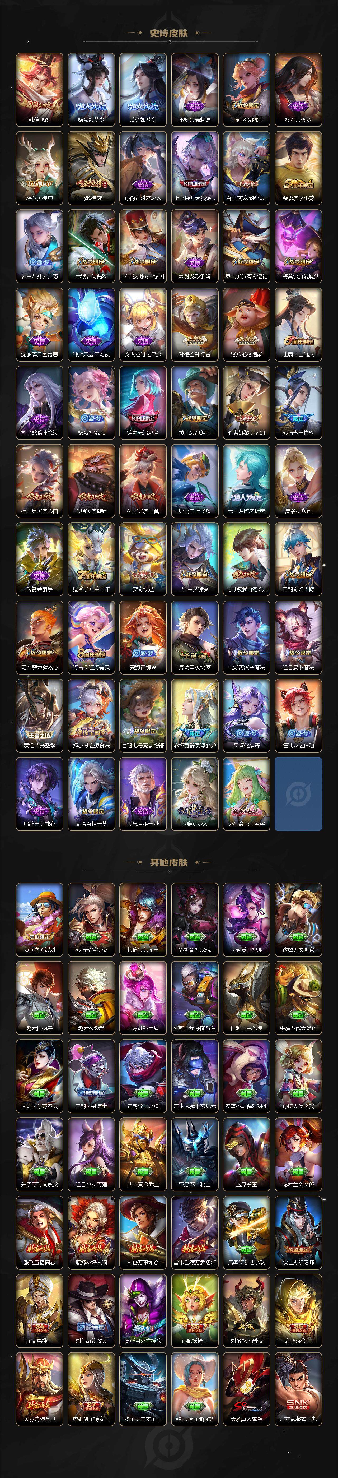 - PX_2072391-贵族8/皮肤147/典藏5/传说10/史诗24/英雄121/武则天/全息碎影/杀手不太冷/赤影疾锋/幻阙歌/优雅恋人/淬星耀世/超时空战士男/仲夏夜之梦/齐天大圣/启明星使/画中仙/绛天战甲/山海苍雷引/浮生妄/女娲愿照千秋盛/狄仁杰阴阳师/凯尔特女王/赵云皇家上将/优雅恋人/庄周高山流水/朔风刀/狄仁杰魔术师/万华元夜/沙漠行僧/项羽海滩派对/醍醐杖/演武夺筹/金庭之子/孙