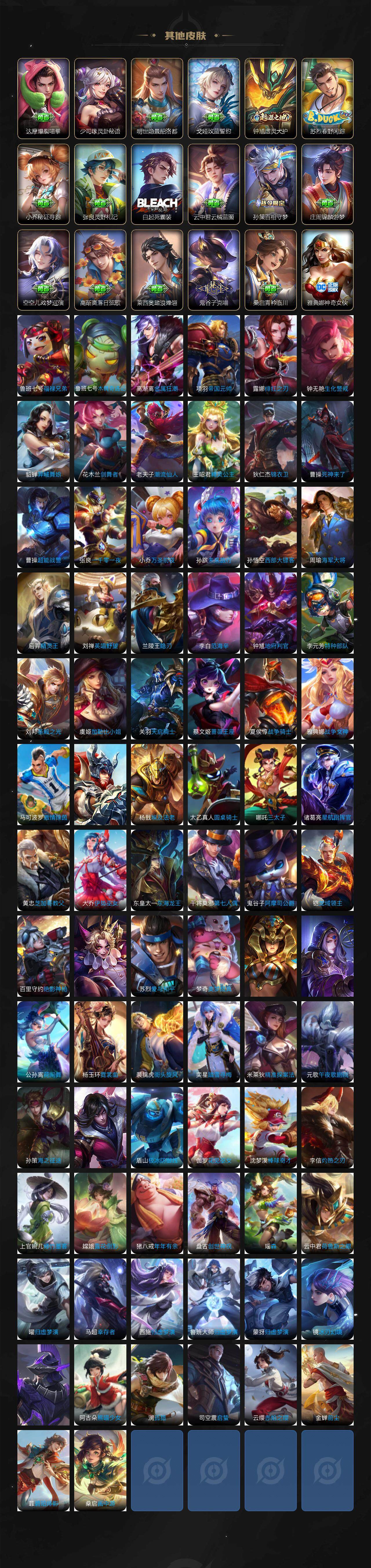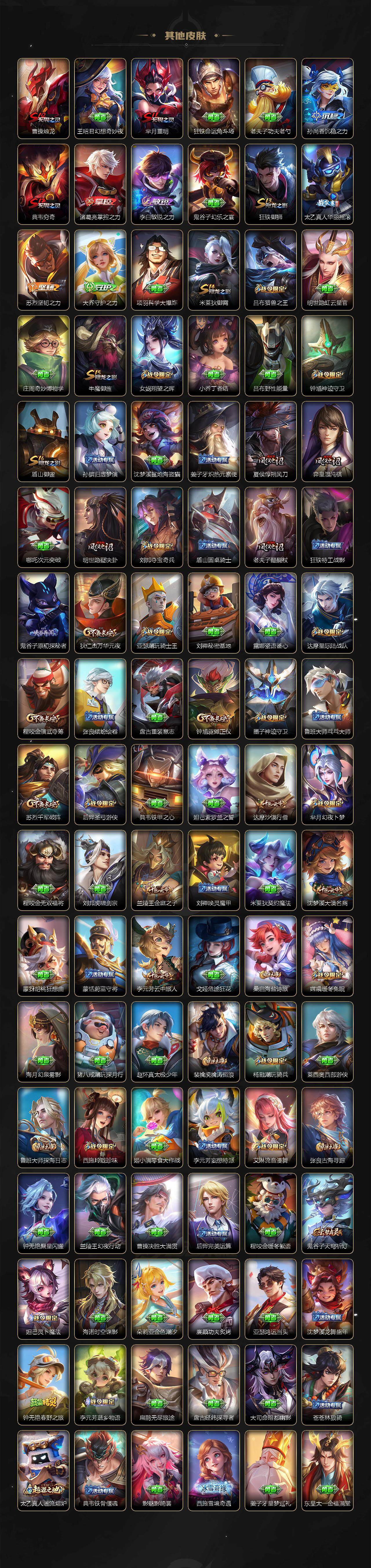 瑶遇见神鹿,娜可露露晚萤,伽罗箭羽风息,李元芳逐浪之夏,不知火舞魅语,公孙离无限星赏官,大乔猫狗日记,孙策猫狗日记,阿轲节奏热浪,露娜紫霞仙子,诸葛亮黄金分割率,韩信白龙吟,项羽苍穹之光,孙尚香时之恋人,阿轲暗夜猫娘,雅典娜冰冠公主,吕布末日机甲,鲁班七号电玩小子,蒙犽龙鼓争鸣,橘右京修罗,墨子龙骑士,嬴政摇滚巨星,刘禅绅士熊喵,刘禅天才门将,白起星夜王子,安琪拉心灵骇客,安琪拉时之奇旅,程咬金功夫厨神,刘邦德古拉伯爵,兰陵王暗隐猎兽者,曹操幽灵船长,宫本武藏鬼剑武藏,司马懿暗渊魔法,亚瑟心灵战警,钟馗乐园奇幻夜,蔡文姬舞动绿茵,廉颇地狱岩魂,小乔缤纷独角兽,夏侯惇乘风破浪,花木兰水晶猎龙者,铠曙光守护者,墨子金属风暴,百里玄策原初追逐者,吕布圣诞狂欢,貂蝉圣诞恋歌,百里守约特工魅影,嬴政暗夜贵公子,嫦娥拒霜思,雅典娜黎明之约,李白千年之狐,哪吒雪上飞焰,夏洛特永昼,澜赏金猎手,蒙犽百解令,周瑜雪夜绮愿,高渐离燃音魔法,赵怀真器灵·浮梦炉