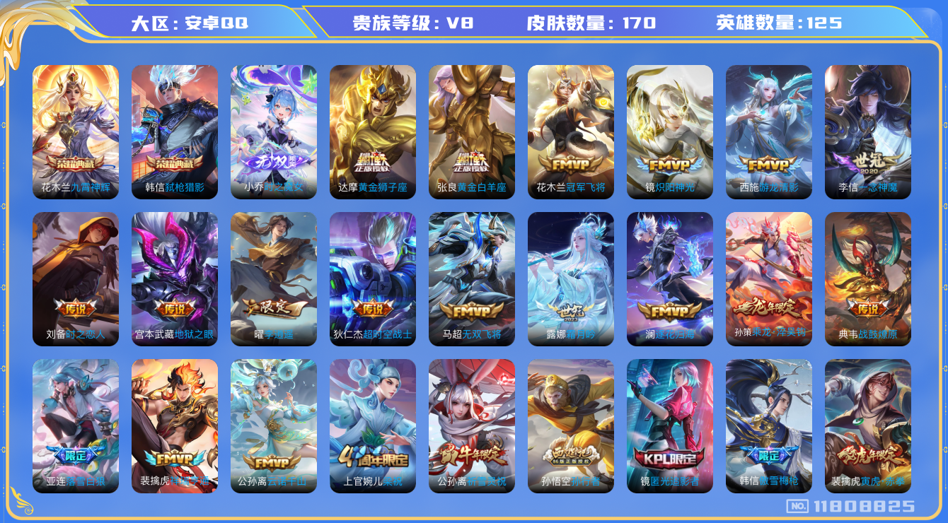 [11808825]【商品标题】:安卓Q-V8-最强王者段位-125英雄-170皮肤-2典藏-0珍品无双-1无双-0珍品传说-26传说-54史诗