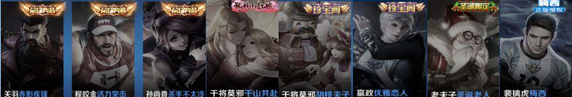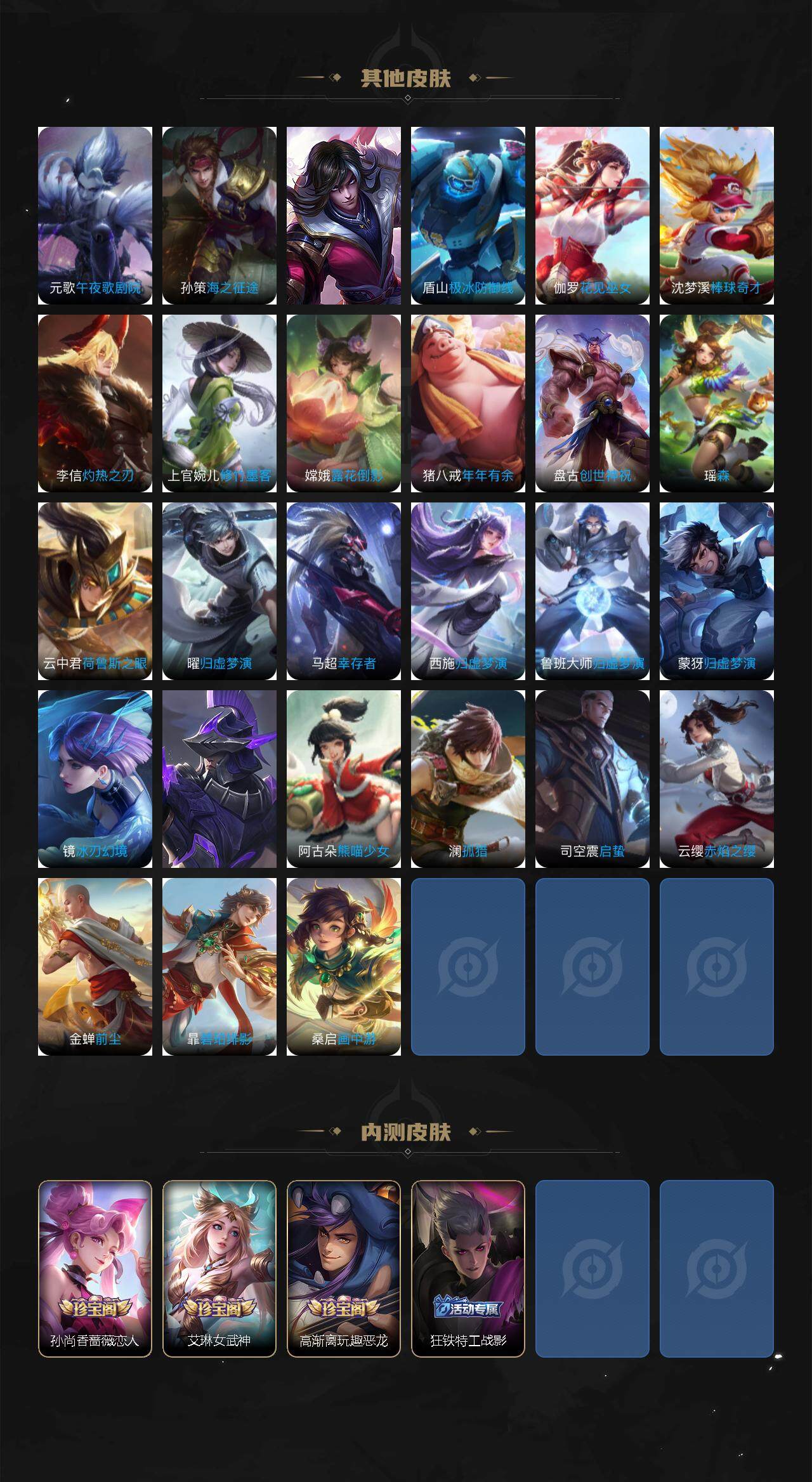 关羽冰锋战神,裴擒虎李小龙,上官婉儿梁祝,牛魔奔雷神使,貂蝉逐梦之音,公孙离祈雪灵祝,吕布御风骁将,诸葛亮时雨天司,赵云龙胆,关羽武圣,黄忠烈魂,张飞虎魄,马超神威,后羿辉光之辰,庄周玄嵩,典韦岱宗,甄姬幽恒,韩信飞衡,伽罗太华,曹操天狼征服者,裴擒虎天狼狩猎者,孙膑天狼运算者,上官婉儿天狼绘梦者,伽罗天狼溯光者,哪吒逐梦之翼,马可波罗逐梦之星,韩信逐梦之影,东皇太一逐梦之光,铠青龙志,百里玄策白虎志,花木兰瑞麟志,苏烈玄武志,百里守约朱雀志,王昭君凤凰于飞,项羽霸王别姬,虞姬霸王别姬,小乔纯白花嫁,周瑜真爱至上,孙悟空大圣娶亲,露娜一生所爱,花木兰默契交锋,兰陵王默契交锋,后羿如梦令,嫦娥如梦令,孙悟空至尊宝,雅典娜神奇女侠,妲己热情桑巴,干将莫邪冰霜恋舞曲,花木兰青春决赛季,蔡文姬奇迹圣诞,妲己时之彼端,公孙离蜜橘之夏,芈月白晶晶,安琪拉魔法小厨娘,赵云引擎之心,孙悟空美猴王,庄周云端筑梦师,鲁班七号乒乒小将,大乔白鹤梁神女,猪八戒猪悟能,廉颇寅虎·御盾,孙尚香异界灵契,孙悟空孙行者,甄姬女儿国国王,镜匿光追影者,韩信傲雪梅枪,鲁班七号寅虎·瑞焰,孙膑寅虎·展翼,杨玉环寅虎·心曲,裴擒虎寅虎·赤拳,云中君时之祈愿,瑶时之祈愿,女娲补天,赵云百木心枪,公孙离玉兔公主,露娜启示之音,夏侯惇匿光决锋者,后羿无尽星芒,马可波罗深海之息,金蝉唐三藏,娜可露露前尘镜,橘右京枫霜尽,鲁班大师匿光启智者,妲己时之奇旅,王昭君星穹之声,不知火舞绯月行,上官婉儿神器·万象笔,盾山梦圆繁星,墨子降魔,李白诗剑行,马可波罗山海·玄木吟,盘古冰霜神祇,瑶山海·碧波行,兰陵王影龙天霄,西施至美·乘鲤谣,甄姬至美·化雀舞,夏侯惇霜北刀,桑启鸣野蒿,艾琳陌上桑,王昭君映山客,澜愿照·九州拓,蔡文姬愿照·福禄聚,虞姬愿照·岁时盈,司空震愿照·山河定,妲己愿照·众生和,女娲愿照·千秋盛