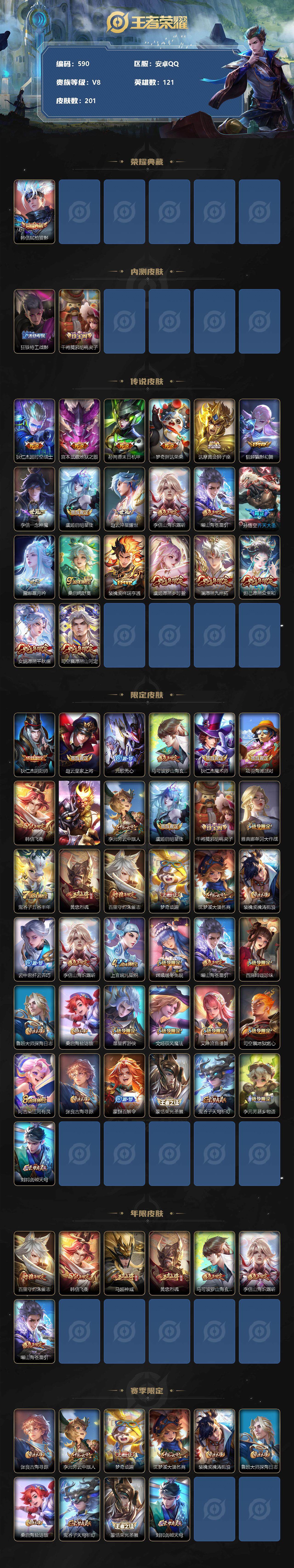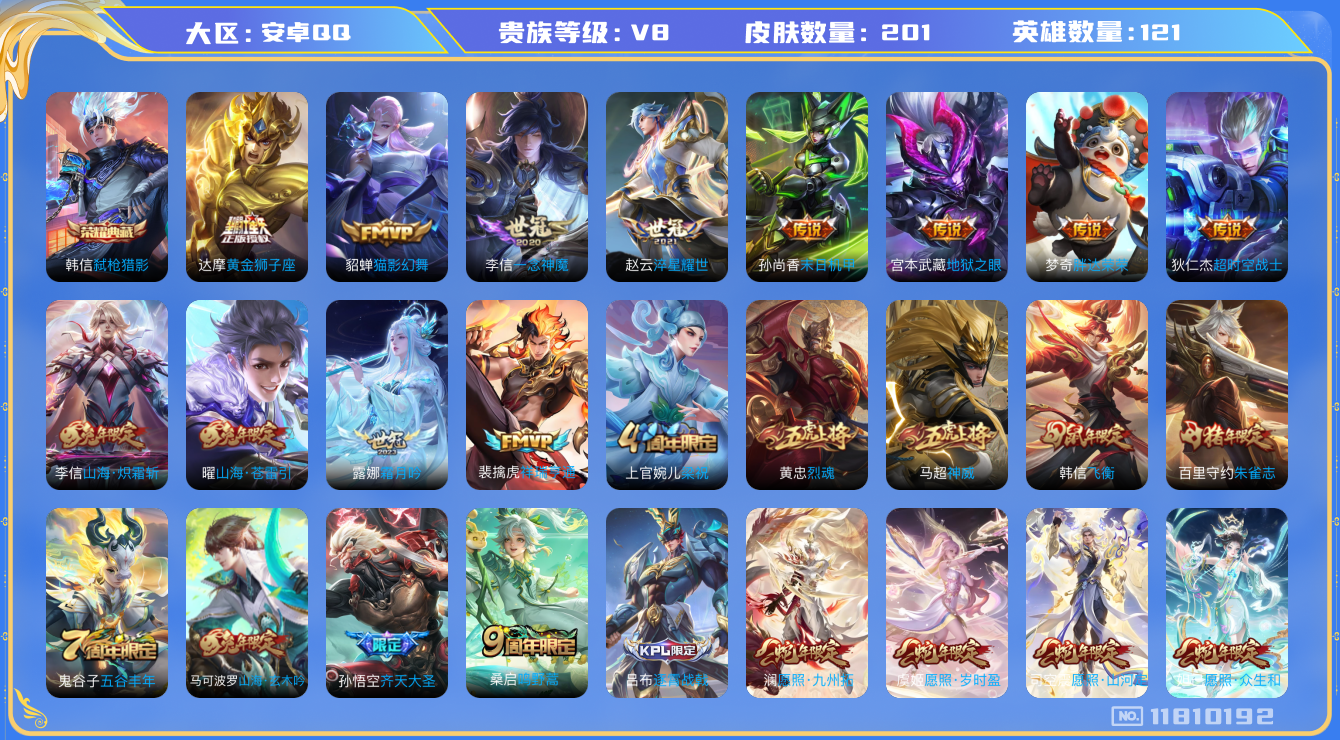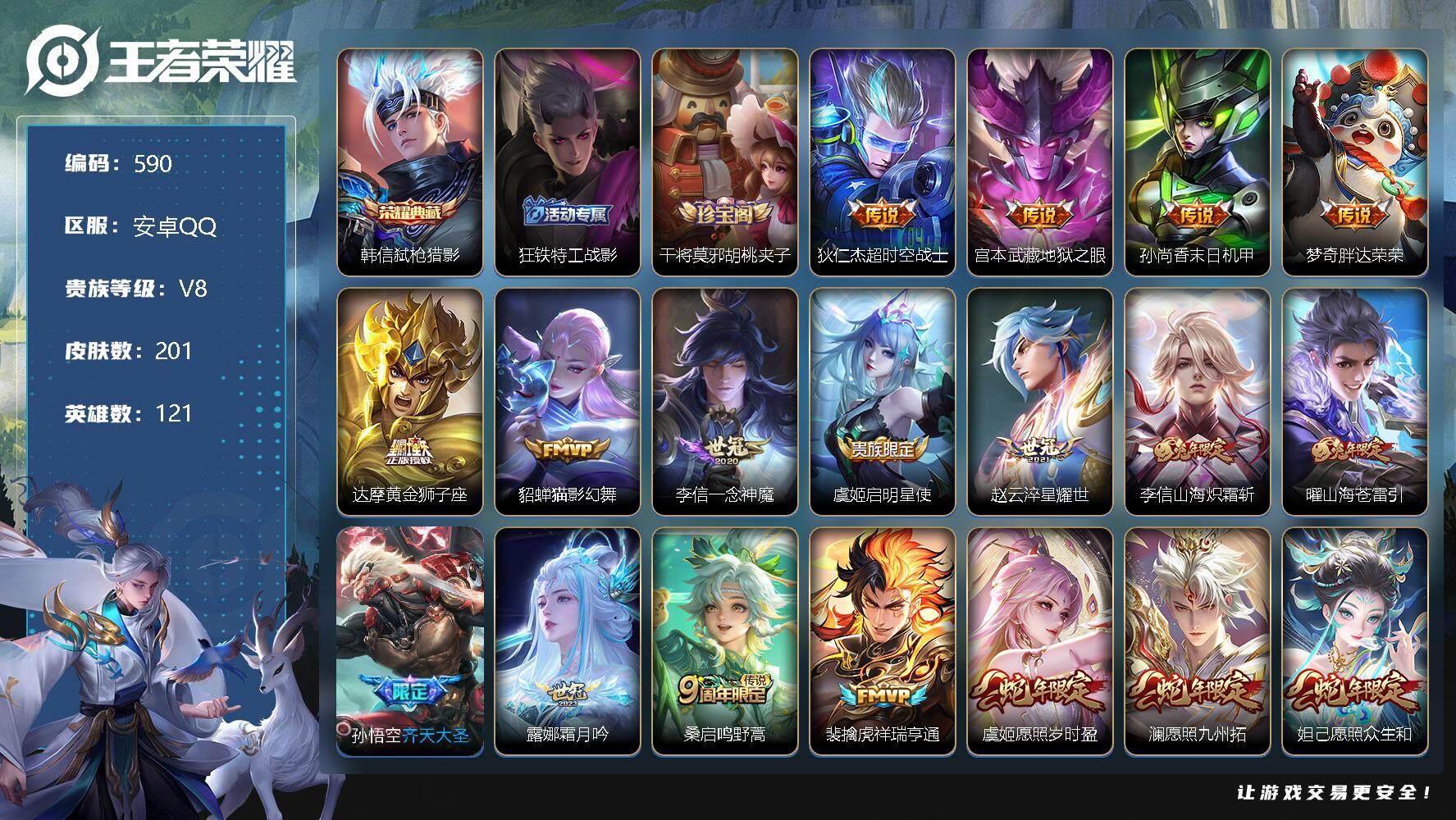 [11810192]【商品标题】:安卓Q-V8-至尊星耀III段位-121英雄-201皮肤-1典藏-0珍品无双-0无双-0珍品传说-20传说-61史诗