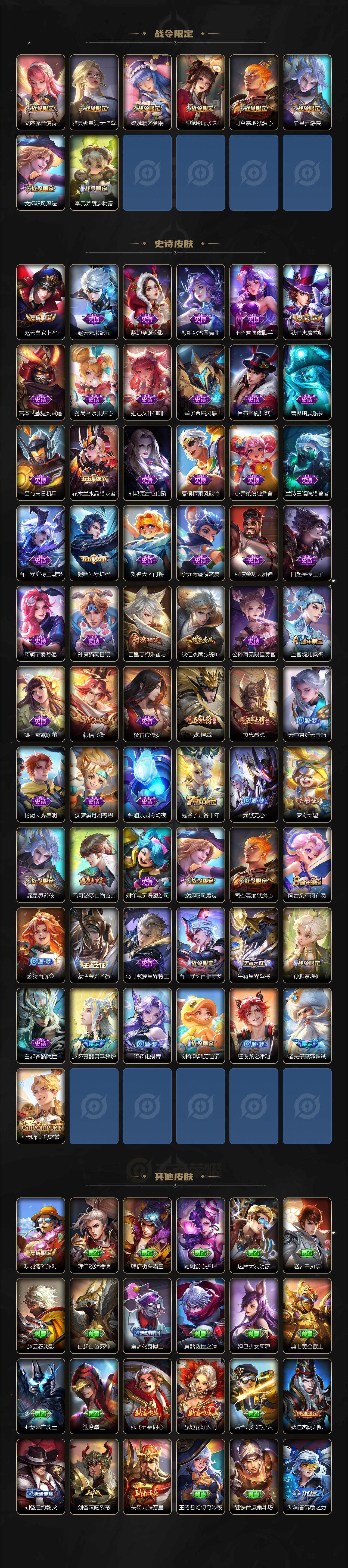 【史诗皮肤】:赵云皇家上将,赵云未来纪元,貂蝉圣诞恋歌,甄姬冰雪圆舞曲,王昭君偶像歌手,狄仁杰魔术师,宫本武藏鬼剑武藏,孙尚香水果甜心,妲己女仆咖啡,墨子金属风暴,吕布圣诞狂欢,曹操幽灵船长,吕布末日机甲,花木兰水晶猎龙者,刘邦德古拉伯爵,夏侯惇乘风破浪,小乔缤纷独角兽,兰陵王暗隐猎兽者,百里守约特工魅影,铠曙光守护者,刘禅天才门将,李元芳逐浪之夏,程咬金功夫厨神,白起星夜王子,阿轲节奏热浪,孙策猫狗日记,百里守约朱雀志,狄仁杰鹰眼统帅,公孙离无限星赏官,上官婉儿梁祝,娜可露露晚萤,韩信飞衡,橘右京修罗,马超神