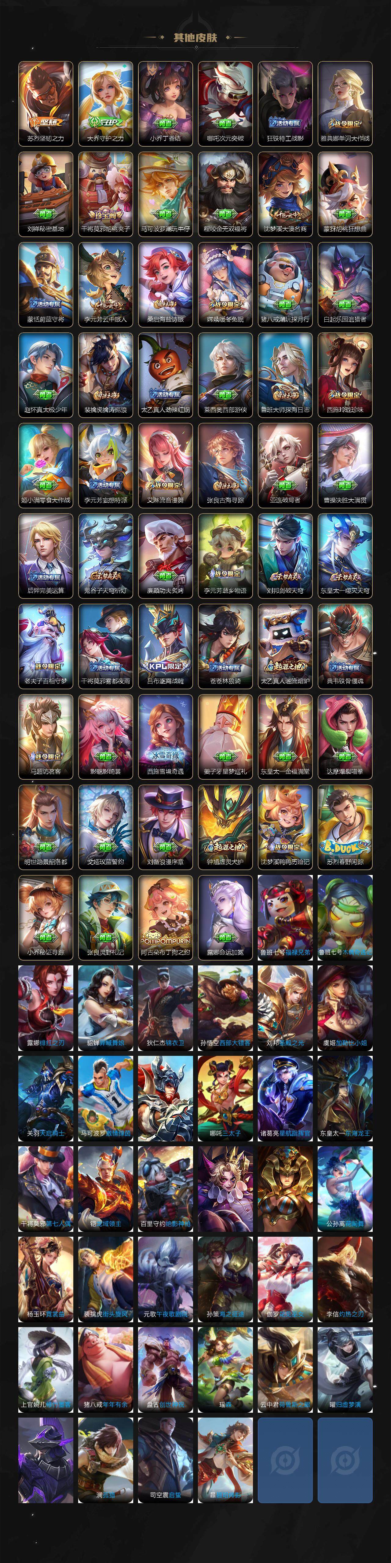娜可露露晚萤,李元芳逐浪之夏,公孙离无限星赏官,孙策猫狗日记,阿轲节奏热浪,王昭君偶像歌手,吕布末日机甲,橘右京修罗,刘禅天才门将,白起星夜王子,程咬金功夫厨神,刘邦德古拉伯爵,兰陵王暗隐猎兽者,曹操幽灵船长,宫本武藏鬼剑武藏,钟馗乐园奇幻夜,杨戬天秀·启明,小乔缤纷独角兽,夏侯惇乘风破浪,花木兰水晶猎龙者,铠曙光守护者,墨子金属风暴,吕布圣诞狂欢,貂蝉圣诞恋歌,百里守约特工魅影,刘禅电玩·爆裂旋风,蒙犽百解令,白起苍鳞隐世,赵怀真器灵·浮梦炉