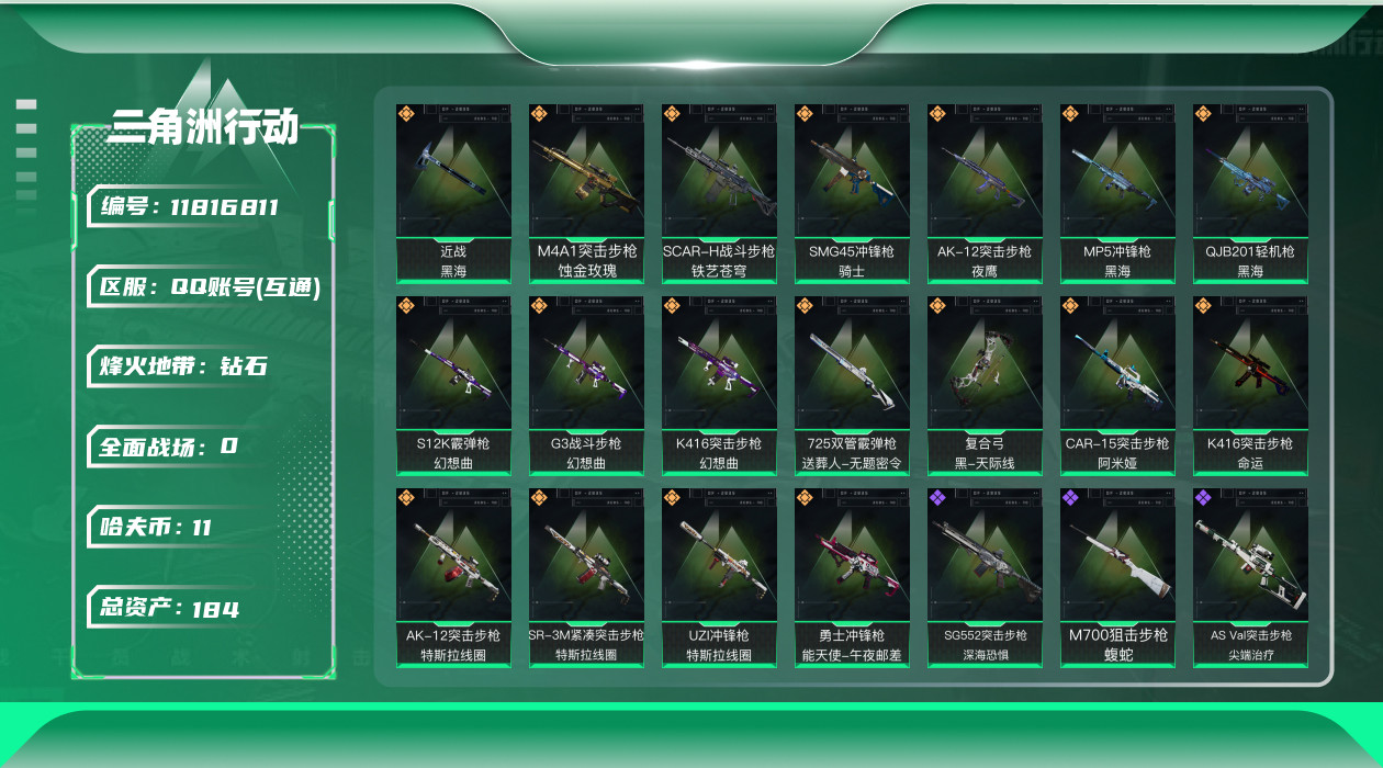 [11816811]总资产:184.3M 5干员外观 1近战传说 18传说枪械 哈夫币:11.581K 顶级安全箱(3×3)9.15号到期 可二次 可修改实名 优质装备:近战-黑海,K416突击步枪-命运(典藏),顶级安全箱(3x3) 烽火地带段位:钻石 全面战场段位:上等兵 传说武器皮肤:SCAR-H战斗步枪-铁艺苍穹,AK-12突击步枪-夜鹰,SMG45冲锋枪-骑士,CAR-15突击步枪-阿米娅,复合弓-黑-天际线,AK-12突击步枪-特斯拉线圈,SR-3M紧凑突击步枪-特斯拉线圈,UZI冲锋枪-特斯拉线圈,勇士冲锋枪-能天使-午夜邮差,725双管霰弹枪-送葬人-无题密令,S12K霰弹枪-幻想曲,MP5冲锋枪-黑海,G3战斗步枪-幻想曲,K416突击步枪-幻想曲,QJB201轻机枪-黑海,M4A1突击步枪-蚀金玫瑰 史诗武器皮肤:K416突击步枪-潜袭者,QBZ95-1突击步枪-ACE,M4A1突击步枪-特勤执行,M700狙击步枪-蝮蛇,PKM通用机枪-蝮蛇,SR-25射手步枪-尖端治疗,PKM通用机枪-荒野求生,AS Val突击步枪-尖端治疗,SG552突击步枪-尖端治疗,Ash-12战斗步枪-守夜人,MP5冲锋枪-深海恐惧,SR-3M紧凑突击步枪-荒野求生,SG552突击步枪-深海恐惧,AKM突击步枪-林中猎手,M16A4突击步枪-竞赛选手,PKM通用机枪-守夜人,SVD狙击步枪-荒野求生,SV-98狙击步枪-林中猎手,PTR-32突击步枪-英雄,PSG-1射手步枪-无垢,AS Val突击步枪-典狱官,M250通用机枪-囚徒,SV-98狙击步枪-囚徒,腾龙突击步枪-无垢,MP7冲锋枪-无垢,QBZ95-1突击步枪-曙光,SCAR-H战斗步枪-危险实验,Vector冲锋枪-阿萨拉文明,SVD狙击步枪-阿萨拉工艺,S12K霰弹枪-曙光 干员外观:红狼-蚀金玫瑰,威龙-壮志凌云,无名-夜鹰,蜂医-送葬人·无题密令(S5),露娜-黑·天际线