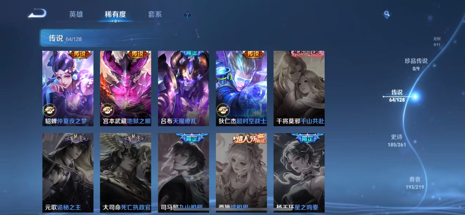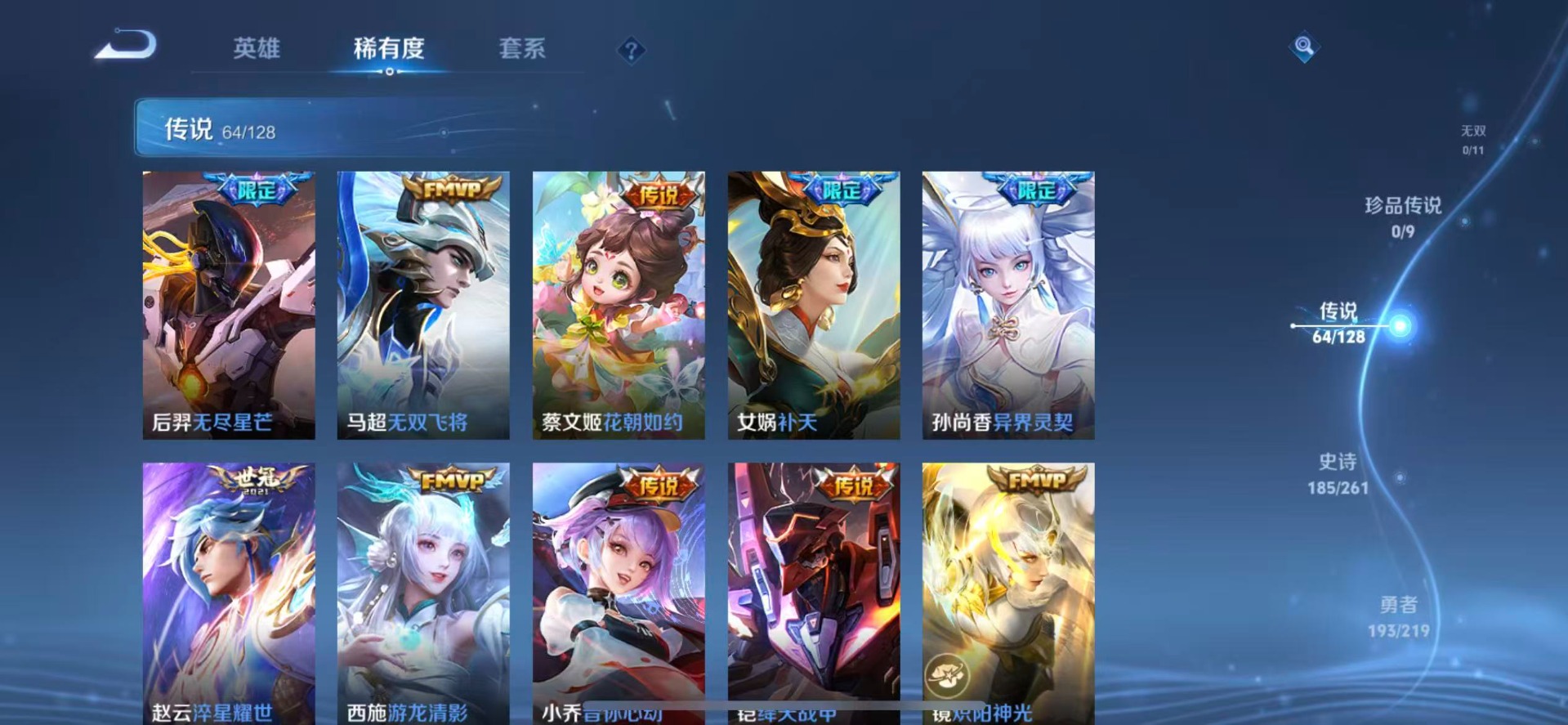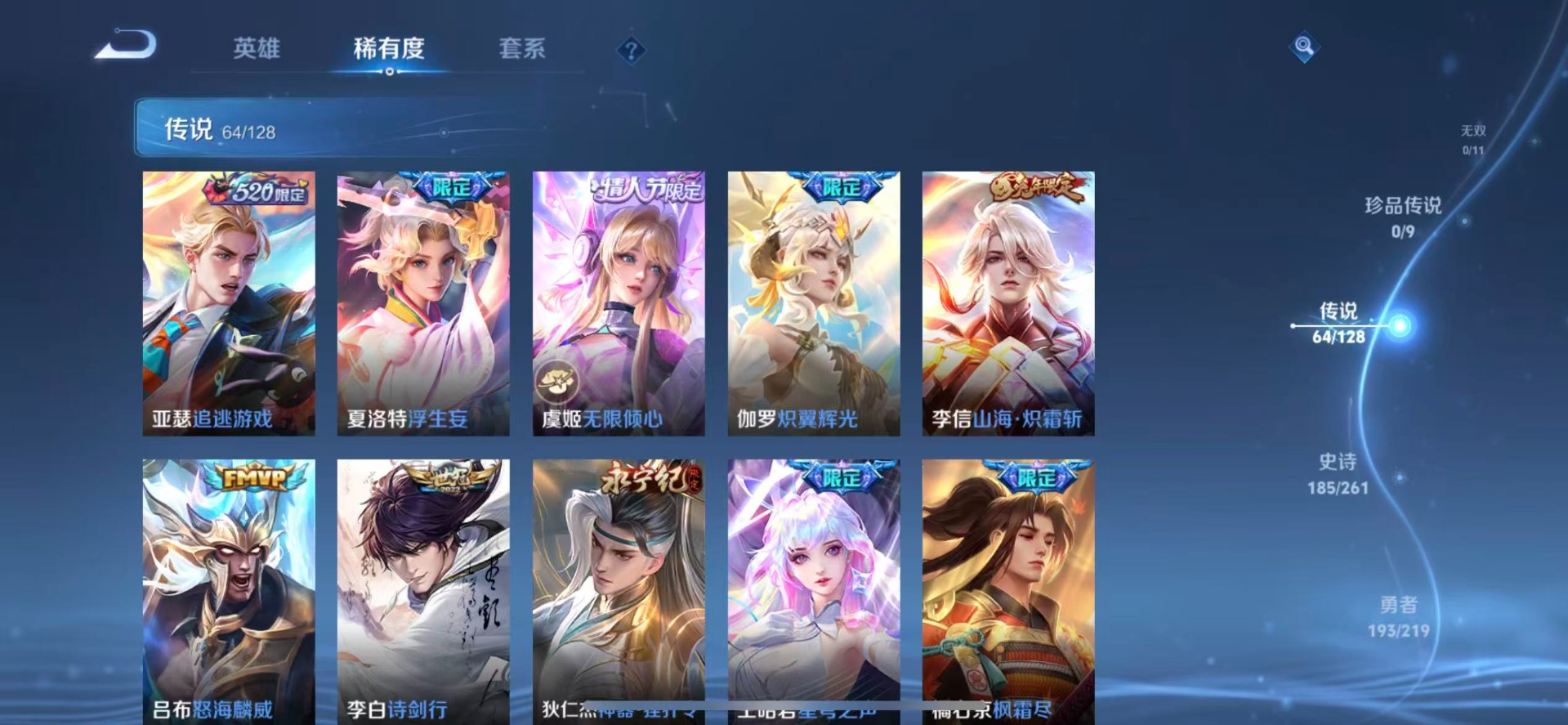 - PX_2073012-【蛇年限定全!】贵族等级: V7 英雄数: 122 皮肤数: 178 珍品传说: 兔狲·蓬尾 星传说: 幽冥之眼 传说皮: 浮生妄,妄想实况,澜逐花归海,幻光神枪 限定皮: 飞衡,五谷丰年,怒海麟威,山海·玄木吟,鸣野蒿,愿照·千秋盛,愿照·众生和,愿照·山河定,愿照·岁时盈,愿照·福禄聚,愿照·九州拓
