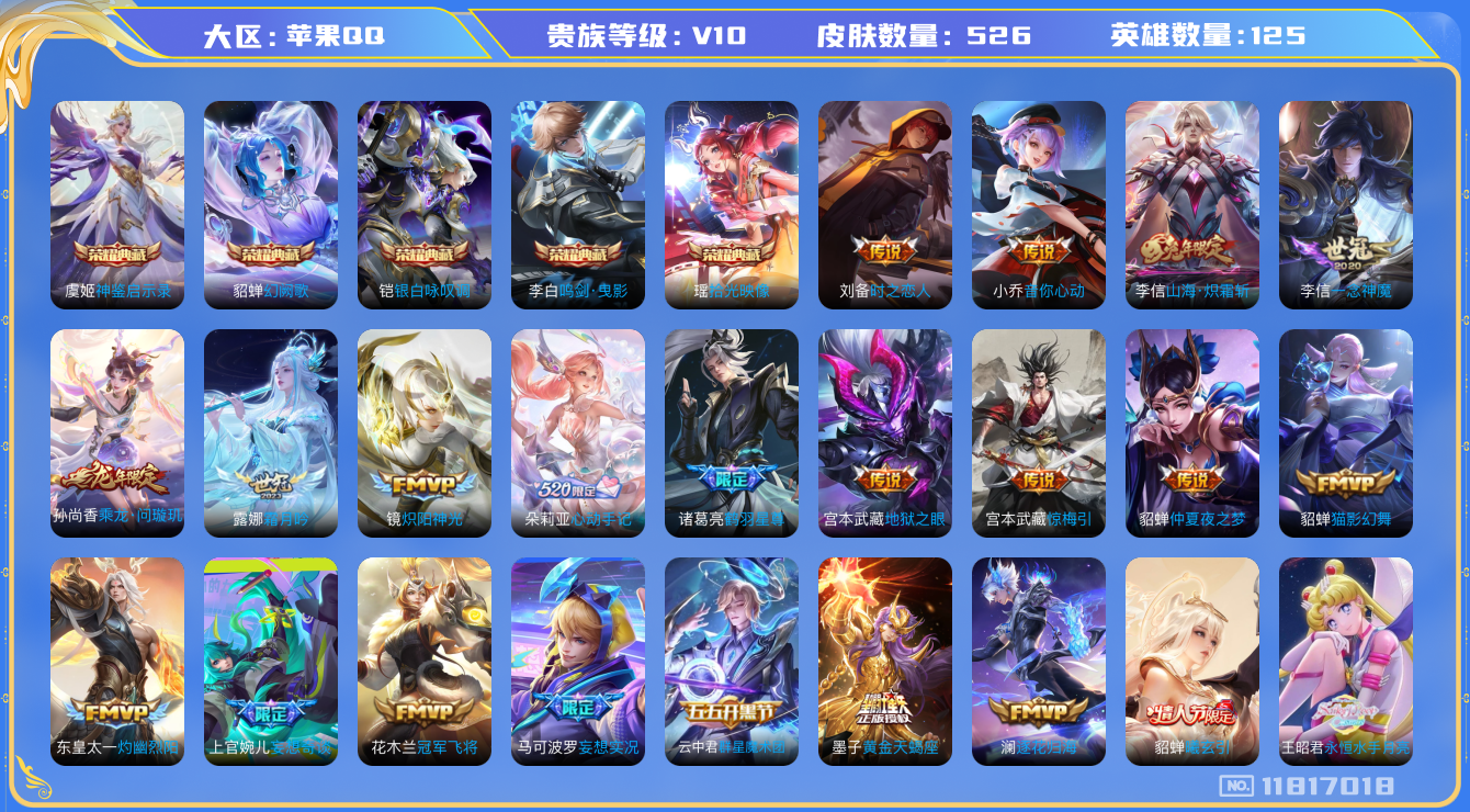 [11817018]V10 5典藏 64传说 125英雄 526皮肤 可修改实名 优质装备:鸣剑·曳影,银白咏叹调(倪克斯侍卫),幻阙歌(貂蝉典藏),神鉴启示录,拾光映像(瑶典藏),黄金狮子座,黄金射手座,冠军飞将,绛天战甲(鸡嘴战神),猫影幻舞,久胜战神,炽阳神光,一念神魔,仲夏夜之梦(大飞蛾),音你心动-小乔,地狱之眼,胖达荣荣,时之恋人-刘备(电焊工),游龙清影(小青龙),淬星耀世,超时空战士-狄仁杰,花朝如约(花篮子),无双飞将,神器·狴犴令,山海·炽霜斩(李信年限),炽翼辉光(娃娃菜牛角包),浮生妄,追逃游戏(亚瑟),鹤羽星尊,灼幽烈阳,妄想实况,妄想奇谈,鹤归松栖(云缨),惊梅引,遇见神鼓,鲁班七号-时之奇旅,大乔-时之奇旅,永恒水手月亮,夜礼服假面,霜月吟,澜逐花归海,艾琳觅芳踪,琥珀纪元铠,琥珀纪元马超,金乌负日,黄金天蝎座,云中君群星魔术团,朵莉亚心动手记 传说皮:乘龙·问璇玑(孙尚香年限),乘龙·铭钟鼎(赵云年限),乘龙·淬吴钩(孙策年限),貂蝉曦玄引,吕布曦玄引,典韦战鼓燎原,落雪白狼,云诺千山 珍宝阁皮:妄想食味,优雅恋人,蔷薇恋人 限定皮:逐霄战戟,至尊宝,武陵仙君(小桃花),异界灵契(白毛香),傲雪梅枪,补天,寅虎·展翼(孙膑年限),星穹之声,白鹤梁神女,白晶晶,至美·乘鲤谣,至美·化雀舞,影龙天霄,遇见飞天,高山流水,诗剑行,无限倾心-虞姬,匿光决锋者,怒海麟威,降魔,五谷丰年,青龙志(铠年限),冰锋战神,天狼运算者,游园惊梦,梁祝,御风骁将(吕布年限),龙胆,逐梦之翼,逐梦之星,烈魂,岱宗(典韦年限),天狼溯光者,天狼征服者,李小龙,逐梦之影,朱雀志(守约年限),如梦令-后羿,霸王别姬-虞姬,孙行者,猪悟能,一生所爱,大圣娶亲,引擎之心,天魔缭乱,云端筑梦师,乒乒小将,热情桑巴,神奇女侠,美猴王,女儿国国王,寅虎·御盾(廉颇年限),寅虎·心曲(虎婆),百木心枪,玉兔公主,无尽星芒,唐三藏,枫霜尽,匿光启智者,神器·万象笔,梦圆繁星 史诗皮:鸭鸭历险记-刘禅,化蝶舞,灵蛊蚀心,星界战将,龙之律动,雪豹·霜爪,石田雨龙,百相守梦-周瑜,茶境仙,怒海争锋,芈月浮光幕影,海诺心动手记,琥珀纪元伽罗,夜落电台,决胜骁骑,上官婉儿群星魔术团,奇遇星旅,蔬乡物语(鲁班七号),超元猎域,乘龙·聚宝船(安琪拉年限),乘龙·忆丹青(大乔年限),百相守梦-黄忠,遇见神鹿,紫