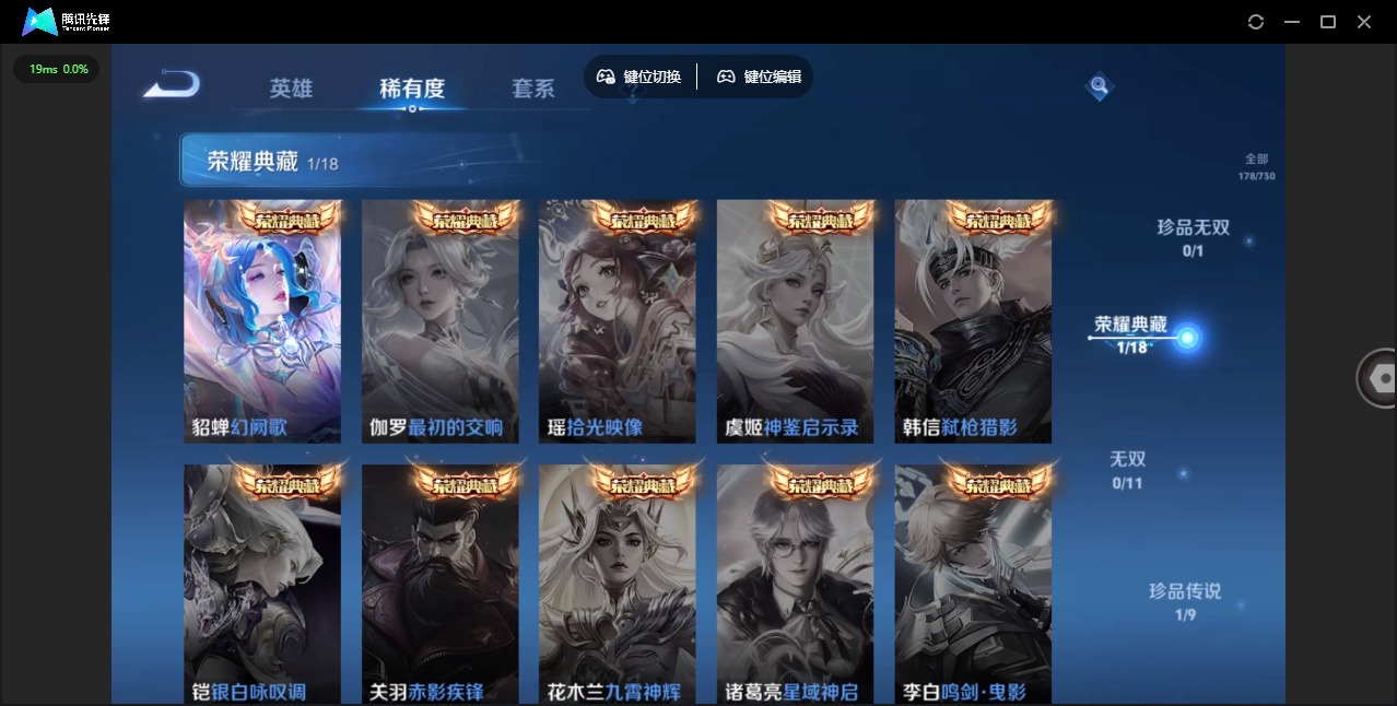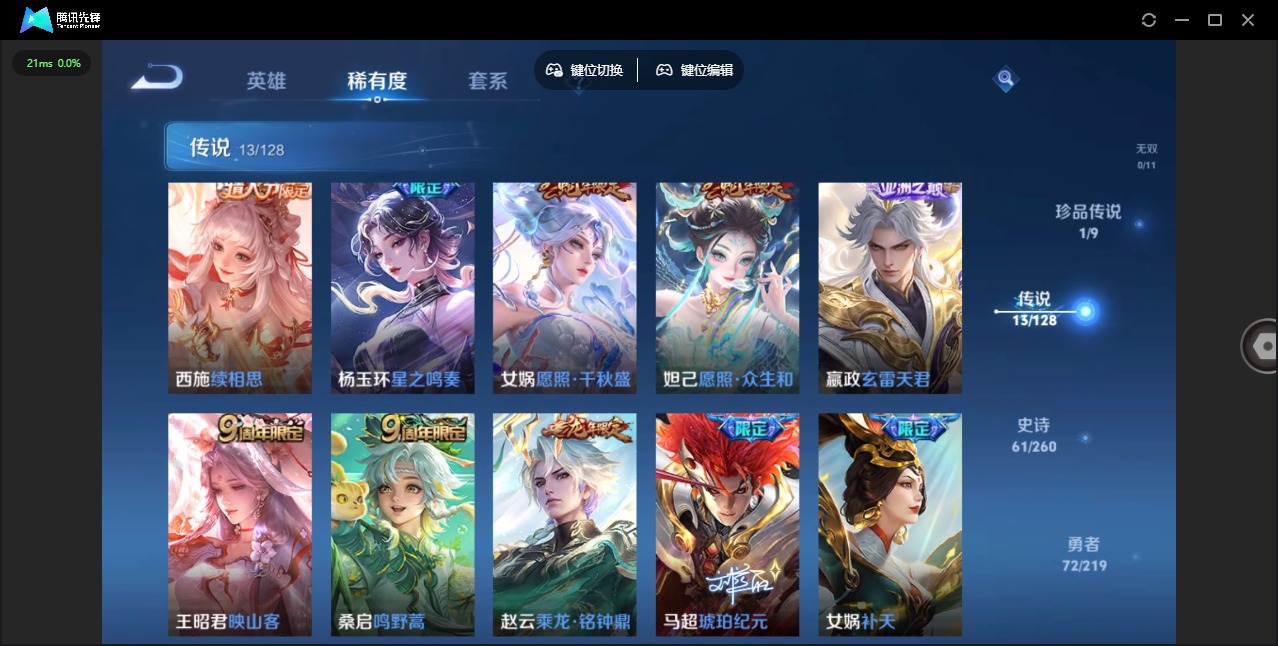- PX_2097223-43 安卓微信/最强王者/162皮肤/124英雄/2典藏/0珍品无双/3无双/0珍品传说/11传说/55史诗/8稀有英雄 【2 典藏皮肤】鸣剑·曳影 李白,幻阙歌 貂蝉, 【3 无双皮肤】时之魔女 小乔,离恨烟 公孙离,群星魔术团 韩信, 【11 传说皮肤】启明星使 虞姬,无双飞将 马超,零号·赤焰 孙悟空,云鹰飞将 曜,落雪白狼 亚连,时之恋人 刘备,天魔缭乱 吕布,乘龙·