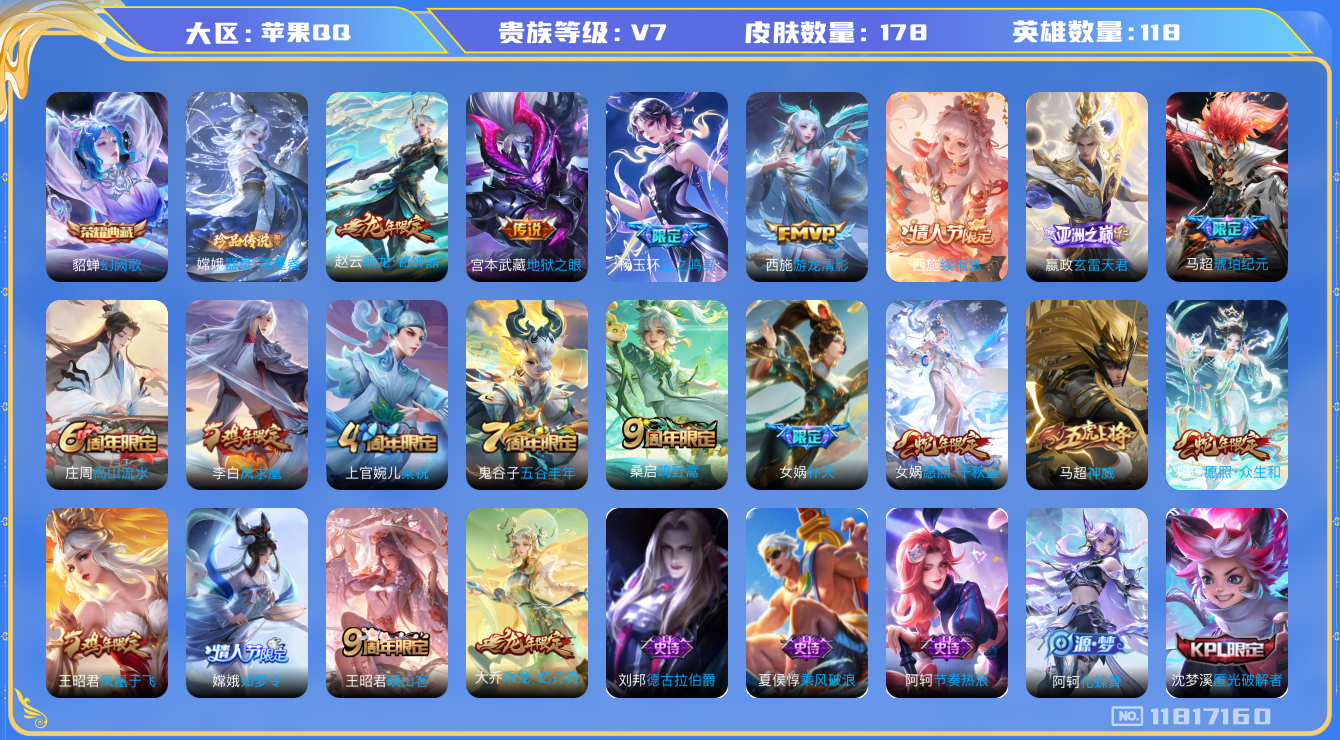 [11817160]V7 1典藏 1珍品传说 13传说 118英雄 178皮肤 可修改实名 女号 嫦娥小国标 嬴政小国标 优质装备:幻阙歌(貂蝉典藏),器灵·落星盏,地狱之眼,游龙清影(小青龙),琥珀纪元马超,玄雷天君,涂山容容 传说皮:乘龙·铭钟鼎(赵云年限),续相思,星之鸣奏 珍宝阁皮:优雅恋人 限定皮:愿照·众生和(妲己年限),愿照·千秋盛(女娲年限),映山客,鸣野蒿,凤求凰(白切鸡),凤凰于飞,补天,神威(电光马子),高山流水,五谷丰年,梁祝,如梦令-嫦娥 史诗皮:器灵·浮梦炉,绮世丹青,化蝶舞,星界战将,琥珀纪元伽罗,乘龙·聚宝船(安琪拉年限),乘龙·忆丹青(大乔年限),百相守梦-百里守约,紫霞仙子,苍穹之光,魅语,蒙恬荣光圣徽,无限星赏官,匿光破解者,偶像歌手,电玩·爆裂旋风,银翎春语,猫狗日记-孙策,乱世虎臣,节奏热浪,女仆咖啡,摇滚巨星,水果甜心,星夜王子,时之奇旅-安琪拉,德古拉伯爵,暗隐猎兽者,幽灵船长,心灵战警,舞动绿茵,地狱岩魂,诗语江南,拒霜思,缤纷独角兽,乘风破浪,逐浪之夏,水晶猎龙者,箭羽风息,原初追逐者,圣诞狂欢,圣诞恋歌,鹰眼统帅,魅力维加斯,黎明之约,无心