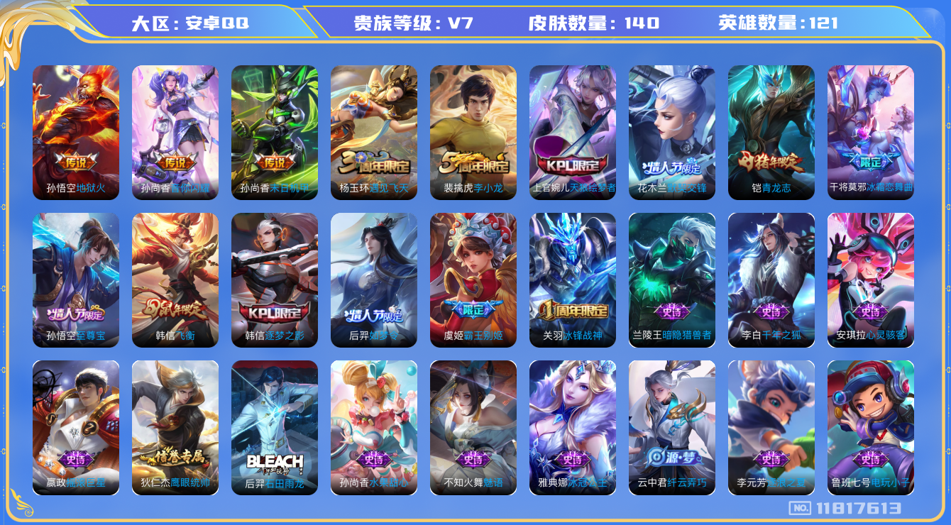 [11817613]V7 3传说 121英雄 140皮肤 可修改实名 女号 优质装备:末日机甲-孙尚香(绿蚂蚱),地狱火,音你闪耀(rap皮) 限定皮:至尊宝,飞衡(韩信年限),遇见飞天,青龙志(铠年限),冰锋战神,天狼绘梦者,李小龙,逐梦之影,如梦令-后羿,霸王别姬-虞姬,默契交锋-花木兰,冰霜恋舞曲 史诗皮:石田雨龙,紫霞仙子,苍穹之光,电玩小子(小书包),千年之狐,魅语,冰冠公主,修罗,摇滚巨星,水果甜心,心灵骇客,暗隐猎兽者,纤云弄巧,繁星吟游(呼啦呼啦),逐浪之夏,圣诞狂欢,鹰眼统帅,魅力维加斯