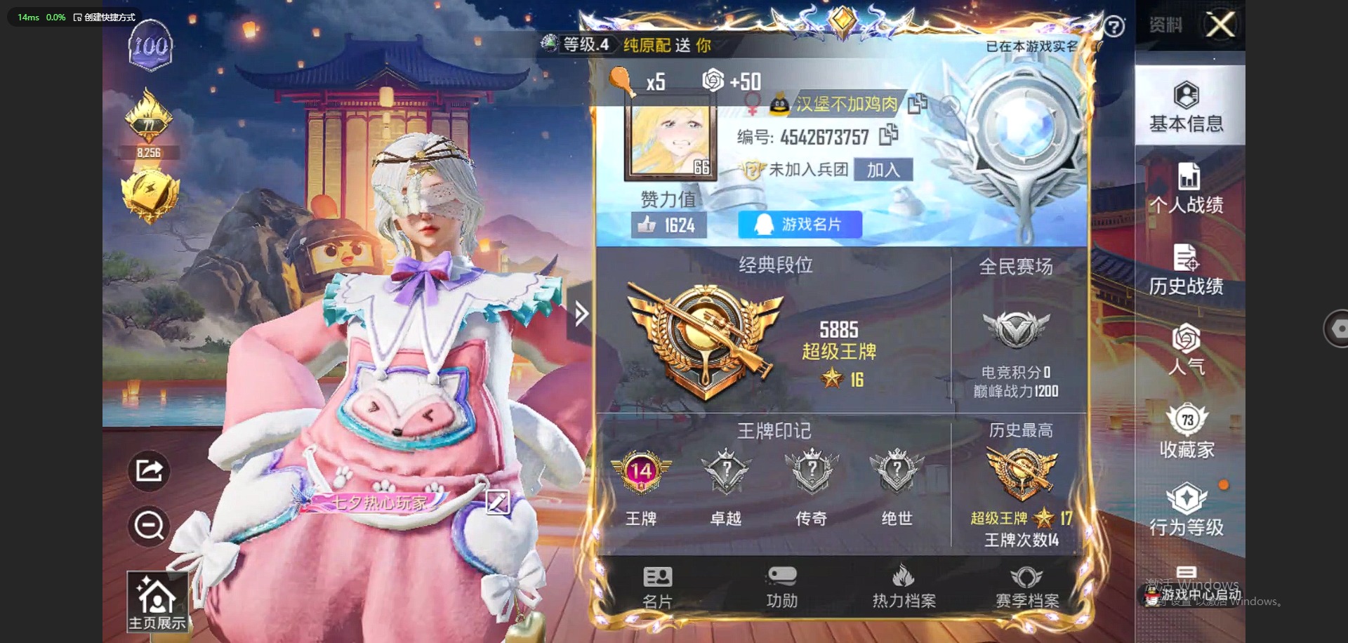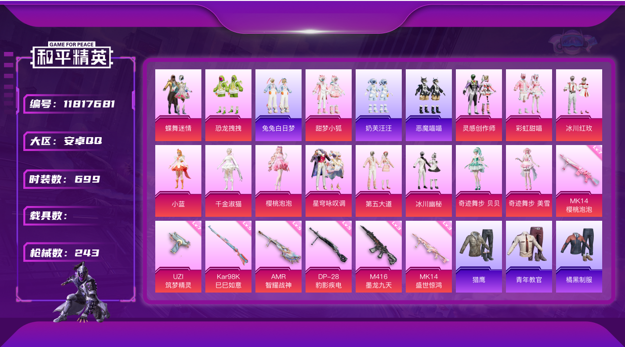 [11817681]14粉装 7特效枪 14印记 可二次 可修改实名 优质装备:蝶舞迷情,UZI筑梦精灵,七级UZI-筑梦精灵,M416墨龙九天,千金淑猫,MK14-盛世惊鸿,樱桃泡泡,MK14-樱桃泡泡,七级MK14-樱桃泡泡,AMR-智耀战神,星穹咏叹调,奇迹舞步-贝贝,奇迹舞步-美雪,Kar98K-巳巳如意 热门装扮:恐龙拽拽,甜梦小狐,灵感创作师,彩虹甜喵,冰川红玫,冰川幽秘,第五大道,小蓝,兔兔白日梦,奶芙汪汪,恶魔喵喵 稀有枪皮:DP-28-豹影疾电 五级特效枪:五级Kar98K-巳巳如意,五级DP-28-豹影疾电,五级AMR-智耀战神 三级特效枪:三级M416-墨龙九天,三级MK14-盛世惊鸿 紫色装扮:田园牧歌,轻风白浪,和煦暖阳,SS22特训,白啸长虹,SS23特训,幻彩翩翩,妙红点点,龙舌兰冰茶,白兰地假日,娇憨猪猪,梦幻奶油,萌趣咩咩,SS21特训,极光玫瑰,SS31特训套装,人气偶像,冰川特警,冷焰舞者,霓虹热舞,旭日情侣,SS30特训套装,云朵鹅,雪绒豹,SS33特训套装,青涩时光,顶瓜瓜,SS20特训,SS16特训,猎梦纪元,飞驰魅影,音速流光,SS19特训,军刀雅典娜,豚鼠丹丹,吉莉礼服,甜心亚梦,虚音幻奏,电音精灵,SS17特训,SS18特训,水晶王族,智慧隐士,都市魅力,酒红色名流,酷潮明星,长空猛禽,霓虹街区,青年教官,缤纷果语,耀眼新星,荣耀,荧惑魅影,蓝彩潮人,蓝色运动,虎虎生威吉莉,街头潮人,蓝海鲸歌,飞行日记,魅力单车,鹤鸣,麻辣教官,黄色伏地魔,黄色名流,黄色运动,黑色伏地魔,龟仙人,冰河战士,龙魂突击队,蝶变,香桃花海,极速红龙,柠萌假日,橘黑制服,海岛探路者,涂山之恋,深蓝色名流,滨海假日,幻影武者,完美偶像,帅气教官,幻世战舞者,怒火燎原,战地督导,探宝勇士,湖蓝色名流,滨海厨神,绮丽涂鸦,疯狂小兔子,白熊同盟,白色伏地魔,破晓战魂,破蛋小黄鸡,福星高照,空岛之星,竞技达人朋克,红色运动,王牌教练,牛气冲天,灼焰舞者,炫蓝之夏,热血青春,牛气满满,猛禽,猎鹰,小熊娃娃,雏菊兔兔,萝兰蝴蝶,SS29特训,星途旅人,创世·幻影,白光莹,纯真浪花,热情海星,曼妙人鱼,SS28特训,卖崽青蛙,迎夏光舞,红潮炫舞,异域银装,鱼渊荷华,玉兔迎春,燕燕于飞,巳巳如意,青团波波,糖糖葫芦,棉花软糖,竞技名士,街头风暴,许七安,裁决天象,深海梦境,惊