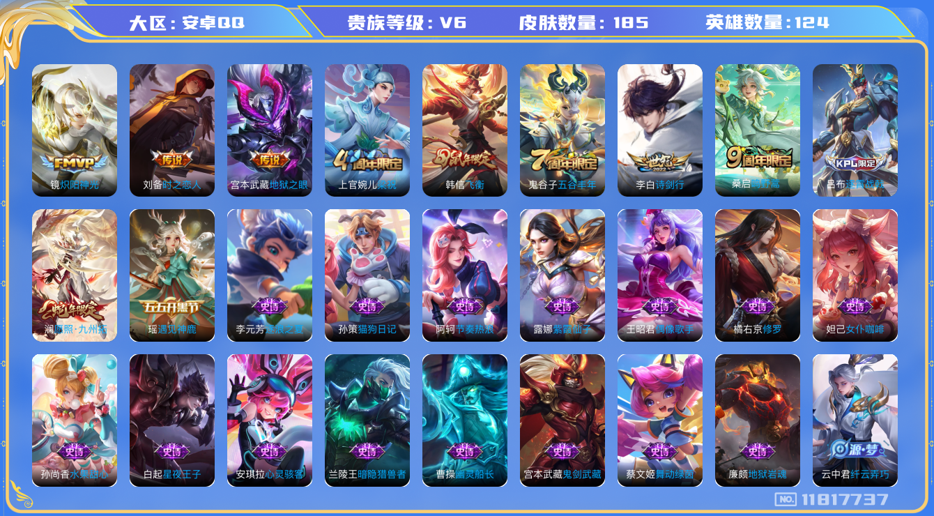 [11817737]【商品标题】:安卓Q-V6-至尊星耀III段位-124英雄-185皮肤-0典藏-0珍品无双-0无双-0珍品传说-6传说-43史诗