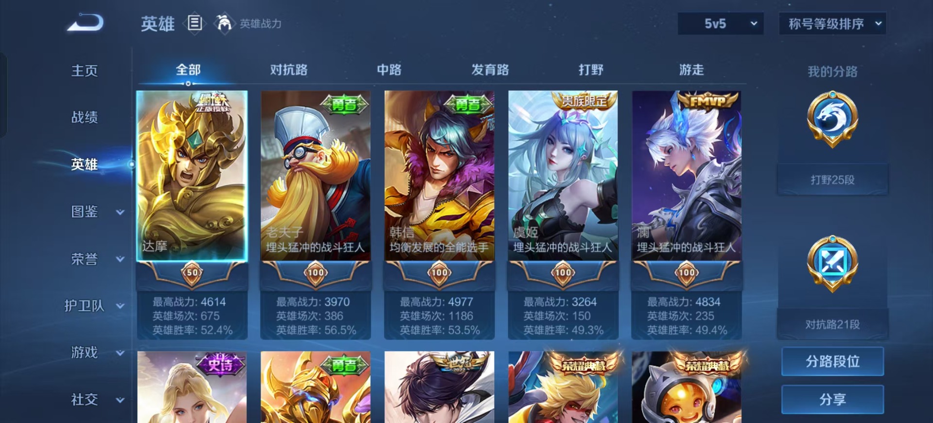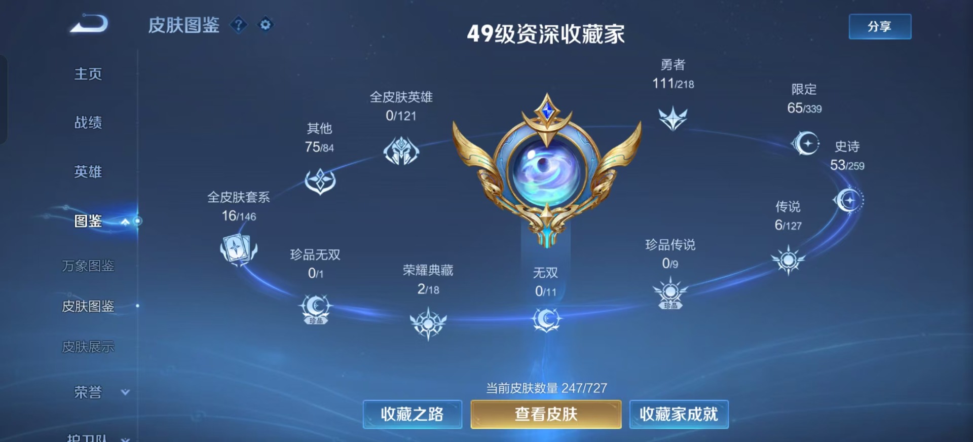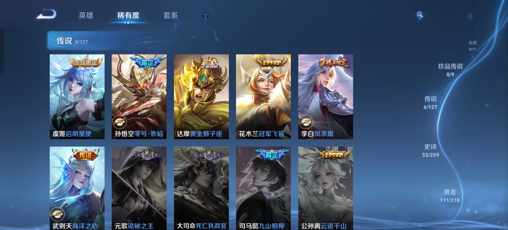 - PX_2023143-贵族等级: V10 英雄数: 124 皮肤数: 463 荣耀水晶: 武则天,倪克斯神谕,无限飓风号,活力突击,大秦宣太后,鸣剑·曳影,星域神启,九霄神辉,赤影疾锋,银白咏叹调,弑枪猎影,神鉴启示录 无双皮: 青丘·九尾,碎月剑心,韩信群星魔术团,花合斗 星传说: 幻海之心,未来机甲,幽冥之眼,零号·雷霆,金色仲夏夜,星际治安官,黛羽霜翎,乞巧织春,玉鸾吟 传说皮: 黄金狮子座