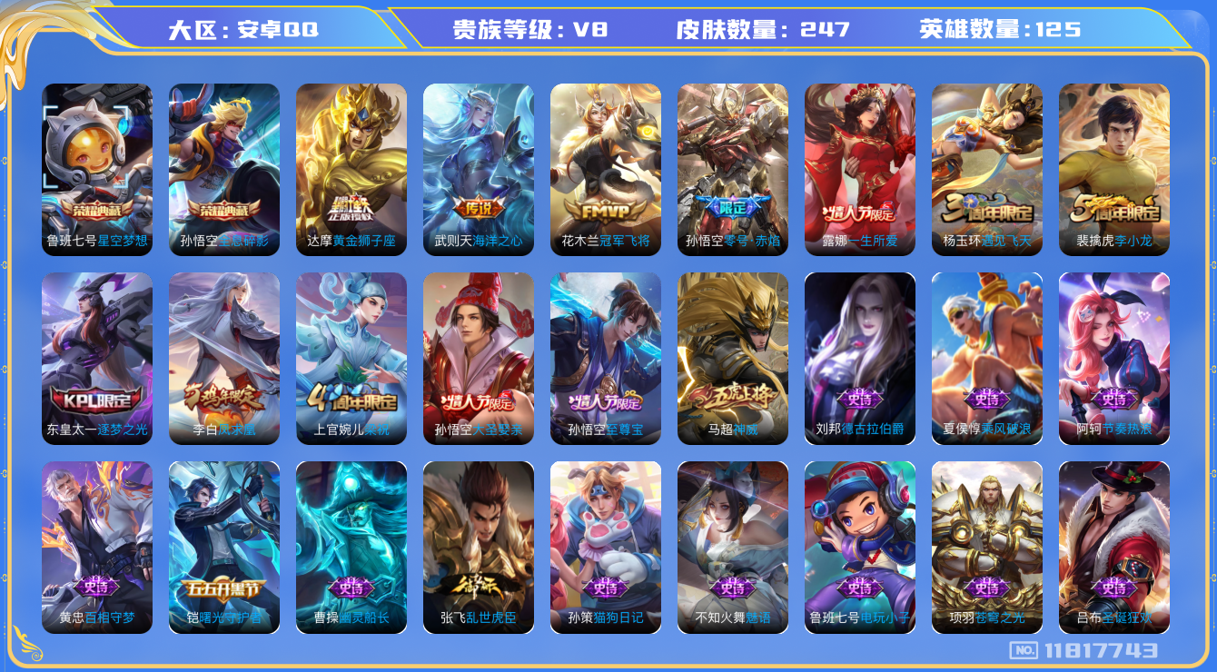 - [11684923]V8 1典藏 2珍品传说 15传说 123英雄 327皮肤 可修改实名 优质装备:神鉴启示录,朽木白哉,黑崎一护,黄金射手座,云鹰飞将(小将军),久胜战神,时之恋人-刘备(电焊工),无双飞将,山海·炽霜斩(李信年限),鹤羽星尊 传说皮:乘龙·淬吴钩(孙策年限),幻光神枪 珍宝阁皮:万物之道,蔷薇恋人 限定皮:愿照·九州拓(澜年限),愿照·千秋盛(女娲年限),逐霄战戟,鸣野蒿,至尊宝,诗剑行,怒海麟威,五谷丰年,梁祝,烈魂,逐梦之音,李小龙,如梦令-后羿 史诗皮:星界战将,茶境仙,苍鳞隐世,谪仙醉月,鸭鸭历险记-刘禅,灵蛊蚀心,龙之律动,藏狐·褐绒,石田雨龙,百相守梦-百里守约,百相守梦-黄忠,上官婉儿群星魔术团,蔬乡物语(鲁班七号),琥珀纪元伽罗,化蝶舞,破空之剑,紫霞仙子,黄金分割率,特工魅影,千年之狐,江河有灵,高渐离燃音魔法,百解令(蒙犽),蒙恬荣光圣徽,冰冠公主,青蛇,魅语,白蛇,电玩·爆裂旋风,猫狗日记-孙策,猫狗日记-大乔,乱世虎臣,节奏热浪,水果甜心,绅士熊喵,天才门将,星夜王子,心灵骇客,德古拉伯爵,暗隐猎兽者,幽灵船长,鬼剑武藏,心灵战警,乐园奇幻夜,天秀·启明,舞动绿茵,纤云弄巧,拒霜思,乘风破浪,逐浪之夏,月团寄思,水晶猎龙者,热力回旋,箭羽风息,金属风暴,原初追逐者,圣诞狂欢,圣诞恋歌,鹰眼统帅,魅力维加斯,黎明之约,天秀·音浪,无心,未来纪元-赵云