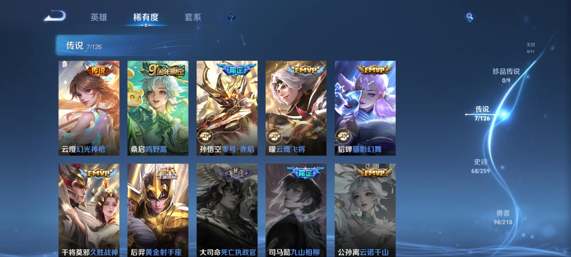 - PX_2103173-Q/至尊星耀/246皮肤/125英雄/1典藏/0珍品无双/2无双/3珍品传说/30传说/73史诗/9稀有英雄 【3 珍品传说】怪盗基德 马可波罗,时之奇旅 孙策,江户川柯南 鲁班七号, 【1 典藏皮肤】鸣剑·曳影 李白, 【2 无双皮肤】离恨烟 公孙离,器灵·螭龙剑 曜, 【30 传说皮肤】鹤归松栖 云缨,启明星使 虞姬,逐花归海 澜,电玩·雷克斯 澜,无双飞将 马超,齐天大