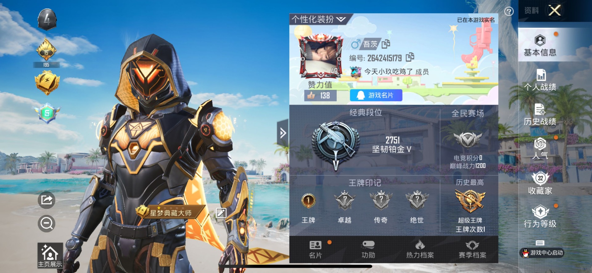 - [11598721]总资产:40.2 2干员外观 1近战传说 9传说枪械 高级安全箱(9.17到期) 可二次 可修改实名 优质装备:近战-北极星,K416突击步枪-命运(典藏) 烽火地带段位:铂金 全面战场段位:无段位 哈夫币:2.769 传说武器皮肤:AK-12突击步枪-夜鹰,M16A4突击步枪-狩猎时刻,Vector冲锋枪-狩猎时刻,G3战斗步枪-狩猎时刻,勇士冲锋枪-能天使-午夜邮差,725双管霰弹枪-送葬人-无题密令,M4A1突击步枪-蚀金玫瑰 干员外观:红狼-蚀金玫瑰,露娜-黑·天际线