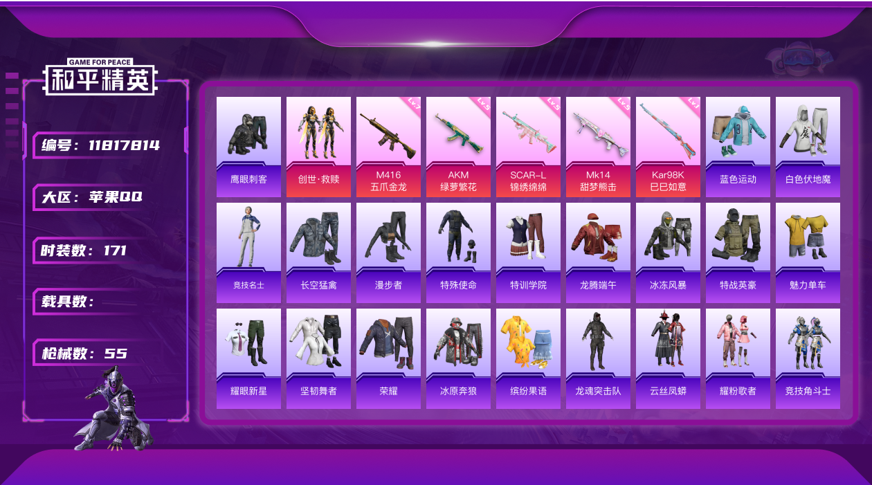 - PX_1981116- 苹果手Q-8王牌印记-14粉装-9特效枪-5载具-66477热力值-127套装-174枪皮-1卓越印记-0传奇印记 【14粉装】,梦幻火箭,蝶舞迷情,洛天依,智能音符,冰川粉黛,冰川幽秘,冰川红玫,旋转彩虹,桃夭倾城,海螺星光,暗夜鎏金,未来歌姬,数码大师,星之彼岸 【9特效枪】AKM-幽焰骑士-3级 M416-五爪金龙-6级 GROZA-旋转彩虹-5级 AUG-星之彼岸-