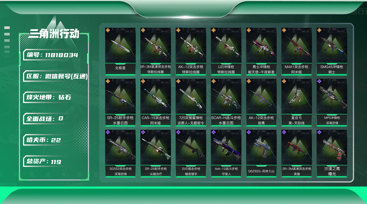 [11818034]总资产:119.7M 4干员外观 1近战传说 13传说枪械 哈夫币:22.594K 可二次 可修改实名 安全保护中 优质装备:近战-北极星,顶级安全箱(3x3) 烽火地带段位:钻石 全面战场段位:军士长 传说武器皮肤:SR-25射手步枪-水墨云图,SCAR-H战斗步枪-水墨云图,SMG45冲锋枪-骑士,UZI冲锋枪-特斯拉线圈,AK-12突击步枪-特斯拉线圈,SR-3M紧凑突击步枪-特斯拉线圈,勇士冲锋枪-能天使-午夜邮差,复合弓-黑-天际线,725双管霰弹枪-送葬人-无题密令,M4A1突击步枪-阿米娅,CAR-15突击步枪-阿米娅,AK-12突击步枪-夜鹰 史诗武器皮肤:AK-12突击步枪-原型机(典藏),SR-3M紧凑突击步枪-英雄,PKM通用机枪-蝮蛇,Ash-12战斗步枪-守夜人,M16A4突击步枪-竞赛选手,PKM通用机枪-守夜人,M700狙击步枪-守夜人,SG552突击步枪-尖端治疗,SR-25射手步枪-尖端治疗,M1014霰弹枪-林中猎手,MP5冲锋枪-深海恐惧,SG552突击步枪-深海恐惧,AKM突击步枪-林中猎手,SVD狙击步枪-暗夜猎手,SV-98狙击步枪-林中猎手,PTR-32突击步枪-英雄,M250通用机枪-囚徒,SV-98狙击步枪-囚徒,腾龙突击步枪-无垢,MP7冲锋枪-无垢,SVD狙击步枪-荒野求生,SR-3M紧凑突击步枪-荒野求生,沙漠之鹰-曙光,Vector冲锋枪-阿萨拉文明,SVD狙击步枪-阿萨拉工艺,QSZ92G-风林火山 干员外观:骇爪-水墨云图,无名-夜鹰,蜂医-送葬人·无题密令(S5),露娜-黑·天际线