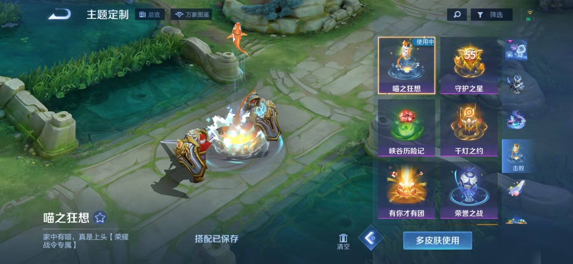 刘邦夺宝奇兵,夏侯惇朔风刀,老夫子醍醐杖,沈梦溪大漠名商,盾山御銮,曹操烛龙,苏烈千军破阵,典韦穷奇,达摩沙漠行僧,牛魔御旌,兰陵王金庭之子,裴擒虎擒涛扼浪,鲁班大师探海日志,明世隐疑决卦,蒙犽狂想玩偶喵,白起狰,鬼谷子原初探秘者,张良古海寻踪,桑启海盐诗旅,狄仁杰万华元夜,芈月重明,程咬金演武夺筹,扁鹊炼金王,李元芳云中旅人,弈星混沌棋,虞姬凯尔特女王,米莱狄御霄,钟馗驱傩正仪,狂铁御狮,太乙真人饕餮