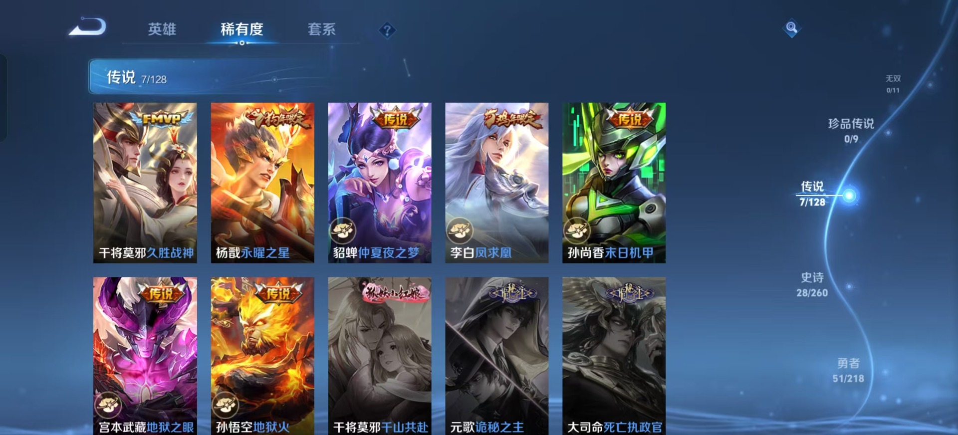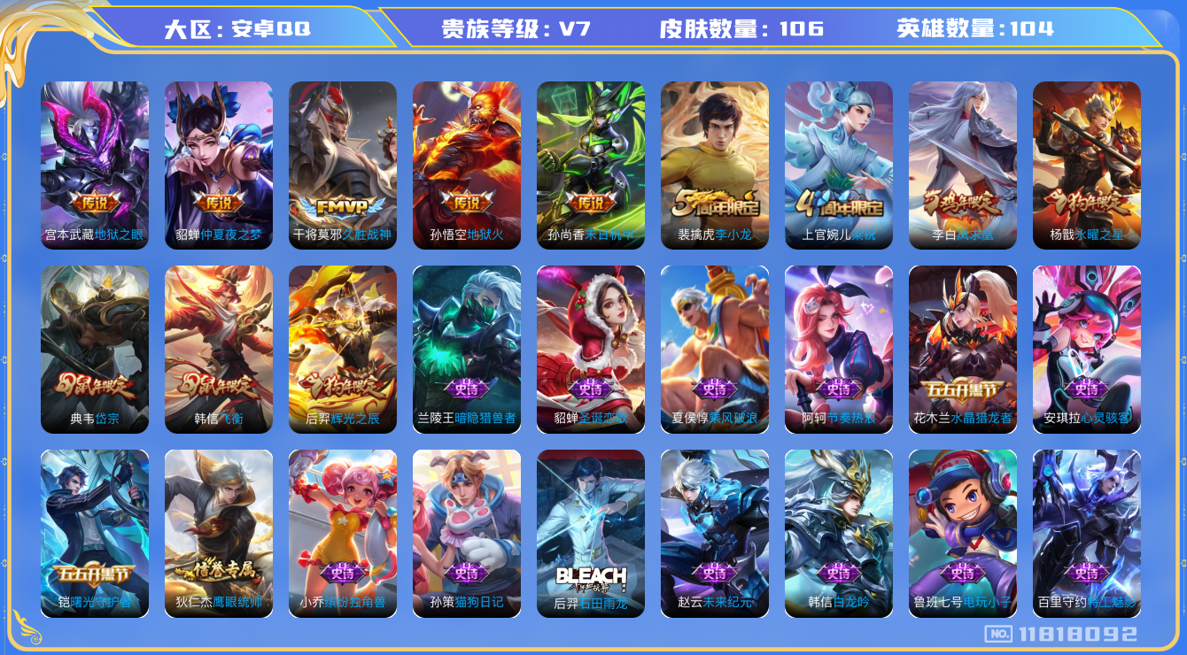 [11818092]V7 7传说 104英雄 106皮肤 可修改实名 优质装备:久胜战神,末日机甲-孙尚香(绿蚂蚱),地狱火,仲夏夜之梦(大飞蛾),地狱之眼 限定皮:凤求凰(白切鸡),飞衡(韩信年限),梁祝,岱宗(典韦年限),李小龙,永曜之星,辉光之辰 史诗皮:石田雨龙,紫霞仙子,苍穹之光,电玩小子(小书包),白龙吟,黄金分割率,特工魅影,猫狗日记-孙策,节奏热浪,心灵骇客,暗隐猎兽者,缤纷独角兽,乘风破浪,逐浪之夏,水晶猎龙者,曙光守护者,圣诞恋歌,鹰眼统帅,魅力维加斯,未来纪元-赵云