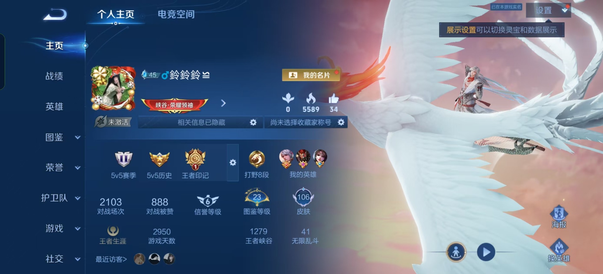 - PX_2111274-实名: 可修改 贵族等级: V8 英雄数: 123 皮肤数: 272 荣耀水晶: 杀手不太冷 传说皮: 黄金狮子座,云鹰飞将,炽阳神光,一念神魔,云霓雀翎,时之恋人-刘备,花朝如约,无双飞将,记忆之芯,灼幽烈阳,小动物乐团,玄雷天君 限定皮: 遇见飞天,李小龙,游园惊梦,青春决赛季,冰霜恋舞曲,大圣娶亲,高山流水,猪悟能,匿光追影者,傲雪梅枪,启示之音,五谷丰年,山海·碧波行