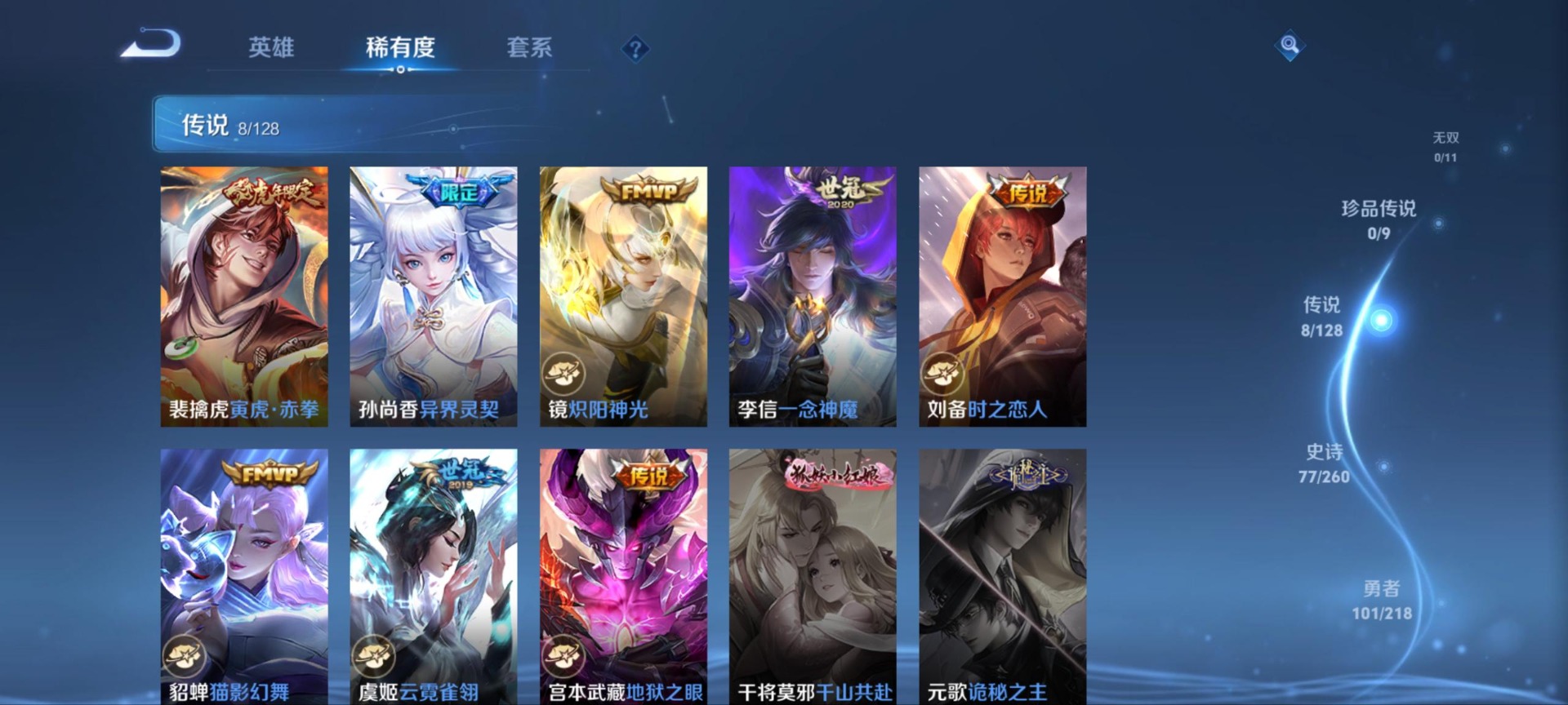 - [11497980]V7 2典藏 1传说 125英雄 141皮肤 典藏英雄武则天 可修改实名 荣耀水晶:全息碎影(猴子典藏),星空梦想(太空人) 传说皮:海洋之心 珍宝阁皮:万物之道 限定皮:大圣娶亲 史诗皮:龙之律动,幻珠鲛人,苍穹之光,白龙吟,千年之狐,冰冠公主,偶像歌手,魅语,末日机甲-吕布,女仆咖啡,水果甜心,天才门将,星夜王子,心灵骇客,功夫厨神,德古拉伯爵,暗隐猎兽者,幽灵船长,纤云弄巧,圣诞恋歌,鹰眼统帅,魅力维加斯