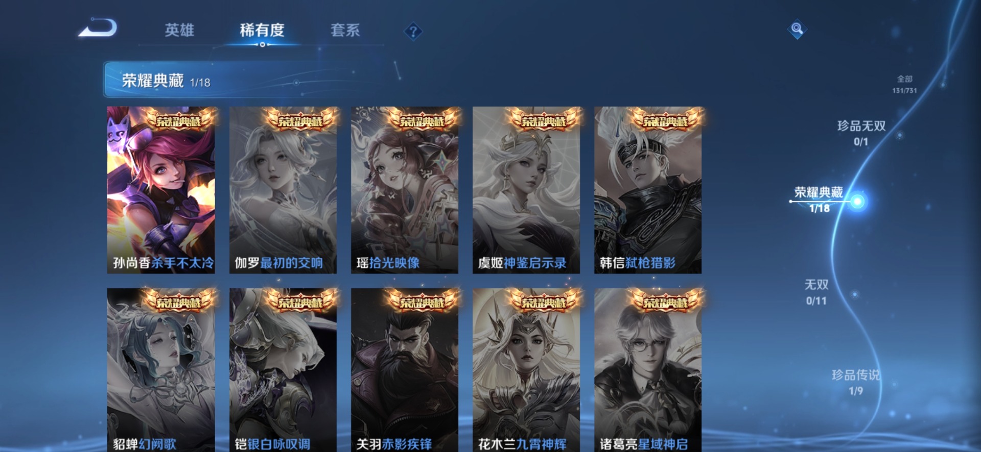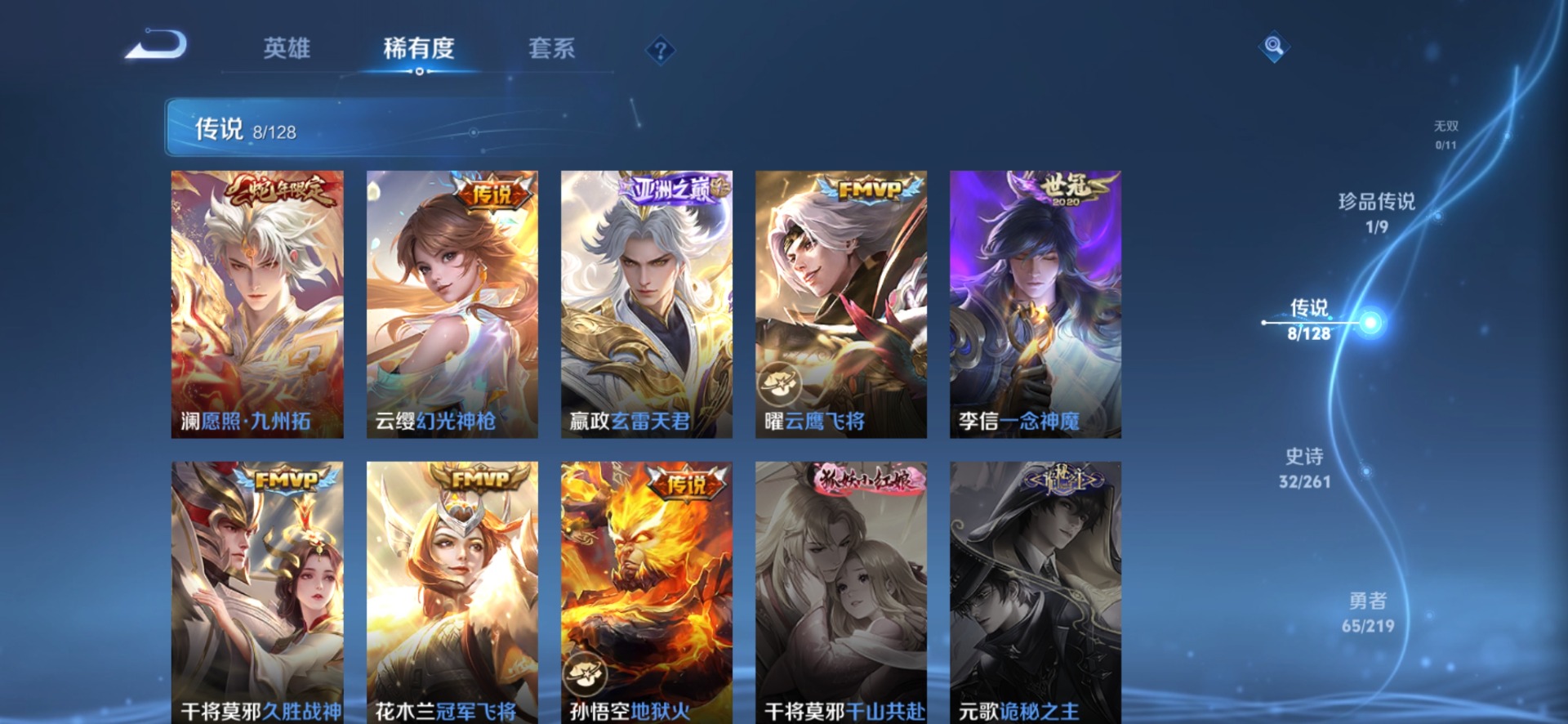 - PX_2096134-17 安卓QQ/无双王者/300皮肤/124英雄/3典藏/0珍品无双/0无双/3珍品传说/28传说/96史诗/8稀有英雄 【3 珍品传说】怪盗基德 马可波罗,时之奇旅 孙策,器灵·落星盏 嫦娥, 【3 典藏皮肤】幻阙歌 貂蝉,神鉴启示录 虞姬,最初的交响 伽罗, 【28 传说皮肤】启明星使 虞姬,逐花归海 澜,诗剑行 李白,浮生妄 夏洛特,地狱之眼 宫本武藏,炽阳神光 镜,遇