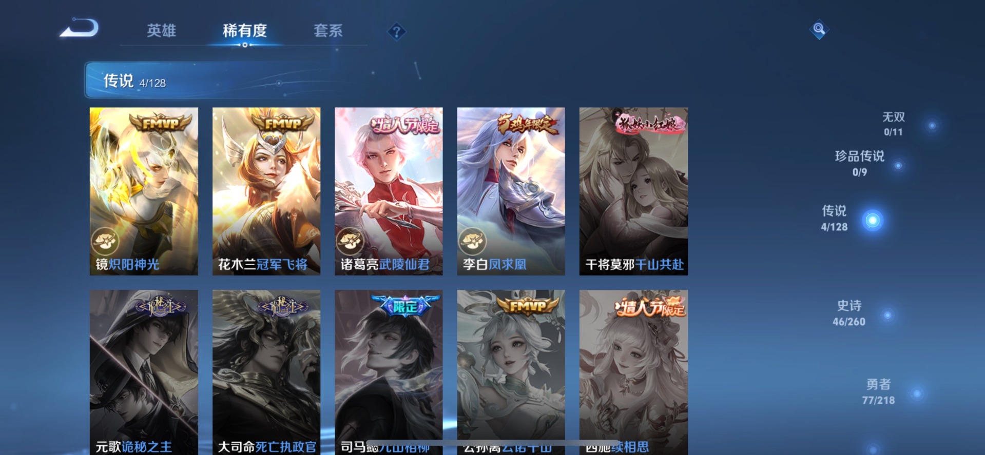 - PX_2097236-47 安卓QQ/永恒钻石/178皮肤/125英雄/0典藏/0珍品无双/1无双/2珍品传说/10传说/34史诗/9稀有英雄 【2 珍品传说】怪盗基德 马可波罗,江户川柯南 鲁班七号, 【1 无双皮肤】离恨烟 公孙离, 【10 传说皮肤】零号·赤焰 孙悟空,云鹰飞将 曜,诗剑行 李白,祈雪灵祝 公孙离,启示之音 露娜,时之恋人 刘备,炽翼辉光 伽罗,冠军飞将 花木兰,愿照·九州拓