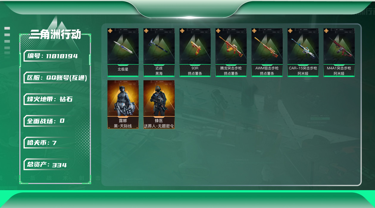 [11818194]总资产:334.3M 2干员外观 2近战传说 7传说枪械 哈夫币:7.925K 可二次 可修改实名 优质装备:近战-黑海,近战-北极星,顶级安全箱(3x3) 烽火地带段位:钻石 全面战场段位:无段位 传说武器皮肤:93R-捞点薯条,AWM狙击步枪-捞点薯条,腾龙突击步枪-捞点薯条,CAR-15突击步枪-阿米娅,M4A1突击步枪-阿米娅 干员外观:蜂医-送葬人·无题密令(S5),露娜-黑·天际线