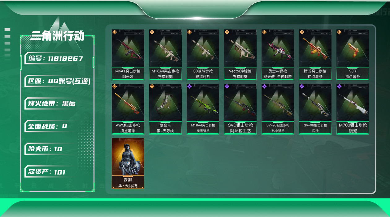 [11818267]总资产:101.7M 1干员外观 9传说枪械 哈夫币:10.449K 进阶安全箱(9.17到期) 可二次 可修改实名 烽火地带段位:黑鹰 全面战场段位:无段位 传说武器皮肤:M16A4突击步枪-狩猎时刻,AWM狙击步枪-捞点薯条,腾龙突击步枪-捞点薯条,93R-捞点薯条,勇士冲锋枪-能天使-午夜邮差,Vector冲锋枪-狩猎时刻,G3战斗步枪-狩猎时刻,复合弓-黑-天际线,M4A1突击步枪-阿米娅 史诗武器皮肤:M700狙击步枪-蝮蛇,M16A4突击步枪-竞赛选手,SV-98狙击步枪-林中猎手,SV-98狙击步枪-囚徒,SVD狙击步枪-阿萨拉工艺 干员外观:露娜-黑·天际线