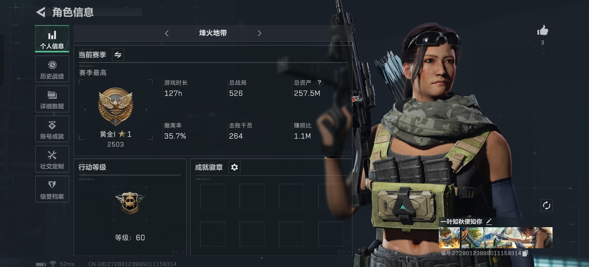 - [11526810]总资产:106.3M 6传说枪械 哈夫币:60.293K 可二次 可修改实名 烽火地带段位:黑鹰 全面战场段位:无段位 传说武器皮肤:M4A1突击步枪-阿米娅,CAR-15突击步枪-阿米娅,复合弓-黑-天际线,AWM狙击步枪-捞点薯条,腾龙突击步枪-捞点薯条,93R-捞点薯条 史诗武器皮肤:勇士冲锋枪-深海恐惧,SV-98狙击步枪-林中猎手,SCAR-H战斗步枪-囚徒