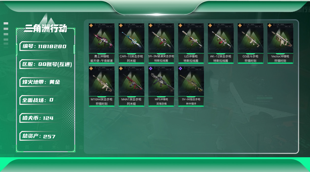 [11818280]总资产:257.5M 9传说枪械 哈夫币:124K 进阶安全箱(2×2)9.15号到期 可二次 可修改实名 烽火地带段位:黄金 全面战场段位:无段位 传说武器皮肤:Vector冲锋枪-狩猎时刻,G3战斗步枪-狩猎时刻,M16A4突击步枪-狩猎时刻,AK-12突击步枪-特斯拉线圈,CAR-15突击步枪-阿米娅,SR-3M紧凑突击步枪-特斯拉线圈,UZI冲锋枪-特斯拉线圈,勇士冲锋枪-能天使-午夜邮差,M4A1突击步枪-阿米娅 史诗武器皮肤:MP5冲锋枪-深海恐惧,SV-98狙击步枪-林中猎手