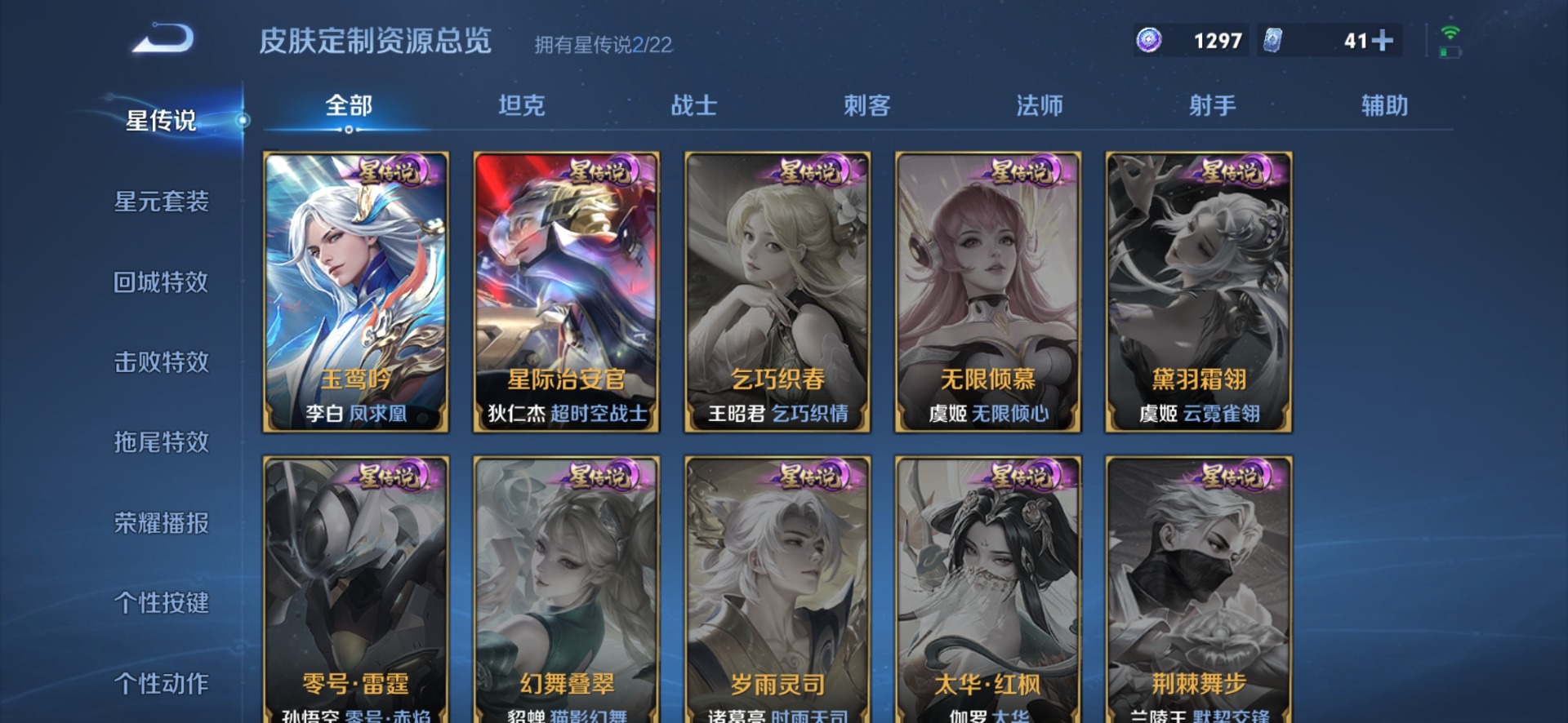 夏侯惇霜北刀,哪吒逐梦之翼,甄姬女儿国国王,盾山梦圆繁星,廉颇寅虎·御盾,伽罗天狼溯光者,赵云百木心枪,孙膑天狼运算者,干将莫邪冰霜恋舞曲,项羽霸王别姬,露娜启示之音,露娜一生所爱,镜匿光追影者,庄周云端筑梦师,杨玉环寅虎·心曲,公孙离祈雪灵祝,司空震愿照·山河定,公孙离蜜橘之夏,貂蝉逐梦之音,裴擒虎李小龙,上官婉儿梁祝,上官婉儿神器·万象笔,上官婉儿天狼绘梦者,李白诗剑行,花木兰青春决赛季,安琪拉魔法小厨娘,马可波罗逐梦之星,马可波罗山海·玄木吟,艾琳陌上桑,桑启鸣野蒿,猪八戒猪悟能,女娲愿照·千秋盛,孙悟空孙行者,孙悟空大圣娶亲,芈月白晶晶,孙悟空至尊宝,孙悟空美猴王,马超神威,雅典娜神奇女侠,赵云引擎之心,盘古冰霜神祇,云中君时之祈愿,妲己愿照·众生和,韩信傲雪梅枪,韩信飞衡,韩信逐梦之影,墨子降魔,蔡文姬愿照·福禄聚,澜愿照·九州拓,虞姬愿照·岁时盈,王昭君凤凰于飞,王昭君星穹之声,关羽冰锋战神