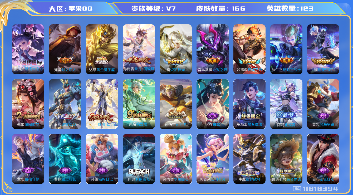 [11818394]V7 1珍品传说 10传说 123英雄 166皮肤 可修改实名 优质装备:酷洛米之心,黄金狮子座,炽阳神光,地狱之眼,时之恋人-刘备(电焊工),超时空战士-狄仁杰,澜逐花归海 传说皮:乘龙·问璇玑(孙尚香年限),祥瑞亨通 珍宝阁皮:万物之道 限定皮:愿照·山河定(司空震年限),逐霄战戟,鸣野蒿,游园惊梦,孙行者 史诗皮:鸭鸭历险记-刘禅,化蝶舞,星界战将,龙之律动,石田雨龙,怒海争锋,破空之剑,蔬乡物语(鲁班七号),百相守梦-黄忠,织梦人,紫霞仙子,特工魅影,千年之狐,江河有灵,高渐离燃音魔法,无限星赏官,冰冠公主,白蛇,末日机甲-吕布,猫狗日记-孙策,修罗,女仆咖啡,水果甜心,天才门将,星夜王子,功夫厨神,暗隐猎兽者,幽灵船长,鬼剑武藏,暗渊魔法,天秀·启明,水晶猎龙者,金属风暴,圣诞狂欢,圣诞恋歌,鹰眼统帅,魅力维加斯,未来纪元-赵云