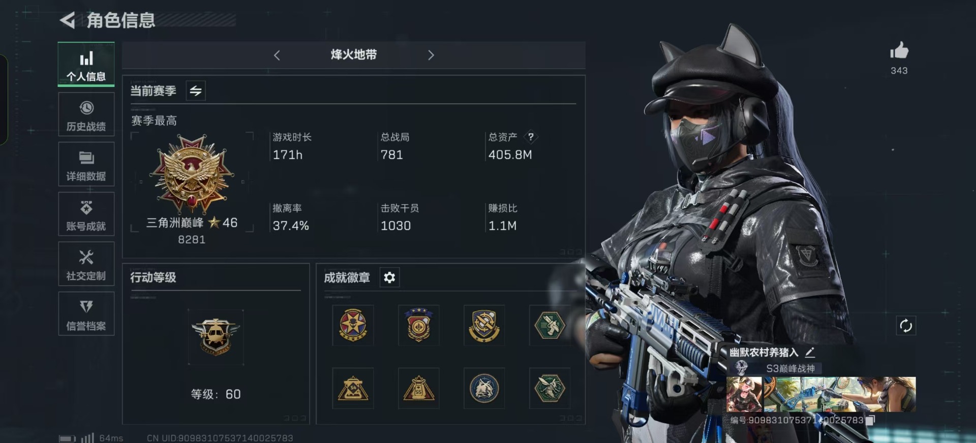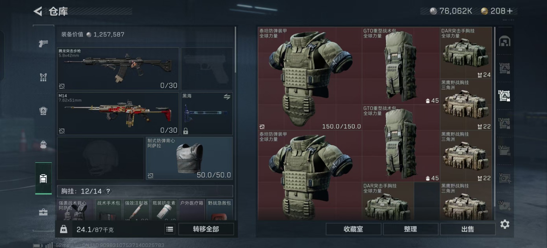 [11818687]总资产:405.8M 3干员外观 1近战传说 16传说枪械 哈夫币:76.062K 顶级安全箱(3×3)9.15号到期 可二次 可修改实名 优质装备:近战-黑海,顶级安全箱(3x3) 烽火地带段位:三角洲巅峰 全面战场段位:无段位 传说武器皮肤:SCAR-H战斗步枪-铁艺苍穹,AK-12突击步枪-夜鹰,SMG45冲锋枪-骑士,G3战斗步枪-流光铂影,M4A1突击步枪-阿米娅,CAR-15突击步枪-阿米娅,复合弓-黑-天际线,AK-12突击步枪-特斯拉线圈,SR-3M紧凑突击步枪-特斯拉线圈,UZI冲锋枪-特斯拉线圈,勇士冲锋枪-能天使-午夜邮差,725双管霰弹枪-送葬人-无题密令,MP5冲锋枪-黑海,QJB201轻机枪-黑海,CAR-15突击步枪-黑鹰坠落 史诗武器皮肤:QBZ95-1突击步枪-ACE,M4A1突击步枪-特勤执行,AUG突击步枪-特勤执行,Vector冲锋枪-红色彗星,PTR-32战斗步枪-ACE,SKS射手步枪-ACE,PKM通用机枪-蝮蛇,G3战斗步枪-战场英杰,Ash-12战斗步枪-守夜人,M16A4突击步枪-竞赛选手,PKM通用机枪-守夜人,AS Val突击步枪-尖端治疗,M700狙击步枪-守夜人,SG552突击步枪-尖端治疗,SR-25射手步枪-尖端治疗,PKM通用机枪-荒野求生,勇士冲锋枪-深海恐惧,SG552突击步枪-深海恐惧,AKM突击步枪-林中猎手,.357左轮-幸运时刻,SR-3M紧凑突击步枪-荒野求生,M1014霰弹枪-林中猎手,QCQ171冲锋枪-禁卫,SV-98狙击步枪-林中猎手,PTR-32突击步枪-英雄,SVD狙击步枪-荒野求生,AS Val突击步枪-典狱官,M250通用机枪-囚徒,SCAR-H战斗步枪-囚徒,腾龙突击步枪-无垢,MP7冲锋枪-无垢,PSG-1射手步枪-无垢,M14射手步枪-黑鹰坠落,M14射手步枪-禁卫,QBZ95-1突击步枪-曙光,沙漠之鹰-曙光,SVD狙击步枪-阿萨拉工艺,S12K霰弹枪-曙光,M7战斗步枪-禁卫,PKM通用机枪-英雄,AUG突击步枪-战术迷彩 干员外观:威龙-壮志凌云,无名-夜鹰,露娜-黑·天际线