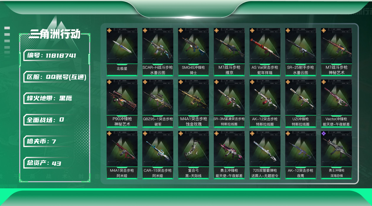 [11818741]总资产:43.8M 1干员外观 1近战传说 20传说枪械 哈夫币:7.747K 可二次 可修改实名 优质装备:近战-北极星 烽火地带段位:黑鹰 全面战场段位:军士长 传说武器皮肤:AS Val突击步枪-蛇年祥瑞,SR-25射手步枪-水墨云图,SCAR-H战斗步枪-水墨云图,AK-12突击步枪-夜鹰,SMG45冲锋枪-骑士,M4A1突击步枪-阿米娅,CAR-15突击步枪-阿米娅,复合弓-黑-天际线,AK-12突击步枪-特斯拉线圈,SR-3M紧凑突击步枪-特斯拉线圈,UZI冲锋枪-特斯拉线圈,勇士冲锋枪-能天使-午夜邮差,725双管霰弹枪-送葬人-无题密令,P90冲锋枪-神秘艺术,M7战斗步枪-神秘艺术,M7战斗步枪-维京,M4A1突击步枪-蚀金玫瑰,QBZ95-1突击步枪-破军,Vector冲锋枪-能天使-午夜邮差 史诗武器皮肤:SR-3M紧凑突击步枪-英雄,AUG突击步枪-蝮蛇,M700狙击步枪-蝮蛇,PKM通用机枪-蝮蛇,G3战斗步枪-战场英杰,SR-25射手步枪-尖端治疗,PKM通用机枪-荒野求生,AS Val突击步枪-尖端治疗,M700狙击步枪-守夜人,SG552突击步枪-尖端治疗,Ash-12战斗步枪-守夜人,MP5冲锋枪-深海恐惧,SR-3M紧凑突击步枪-荒野求生,勇士冲锋枪-深海恐惧,SG552突击步枪-深海恐惧,AKM突击步枪-林中猎手,M16A4突击步枪-竞赛选手,PKM通用机枪-守夜人,SVD狙击步枪-荒野求生,M14射手步枪-禁卫,M1014霰弹枪-林中猎手,SV-98狙击步枪-林中猎手,PTR-32突击步枪-英雄,PSG-1射手步枪-无垢,AS Val突击步枪-典狱官,M250通用机枪-囚徒,SV-98狙击步枪-囚徒,SCAR-H战斗步枪-囚徒,腾龙突击步枪-无垢,MP7冲锋枪-无垢,M700狙击步枪-阿萨拉工艺,QBZ95-1突击步枪-曙光,UZI冲锋枪-危险实验,M249轻机枪-维京,SCAR-H战斗步枪-危险实验,沙漠之鹰-曙光,K416突击步枪-竞技风,SCAR-H战斗步枪-国风,G3战斗步枪-阿萨拉工艺,Vector冲锋枪-阿萨拉文明,SVD狙击步枪-阿萨拉工艺,S12K霰弹枪-曙光,AS Val突击步枪-刀锋,PKM通用机枪-魔药,M14射手步枪-黑鹰坠落,M700狙击步枪-竞技风,QSZ92G-风林火山,93R-博士 干员外观:骇