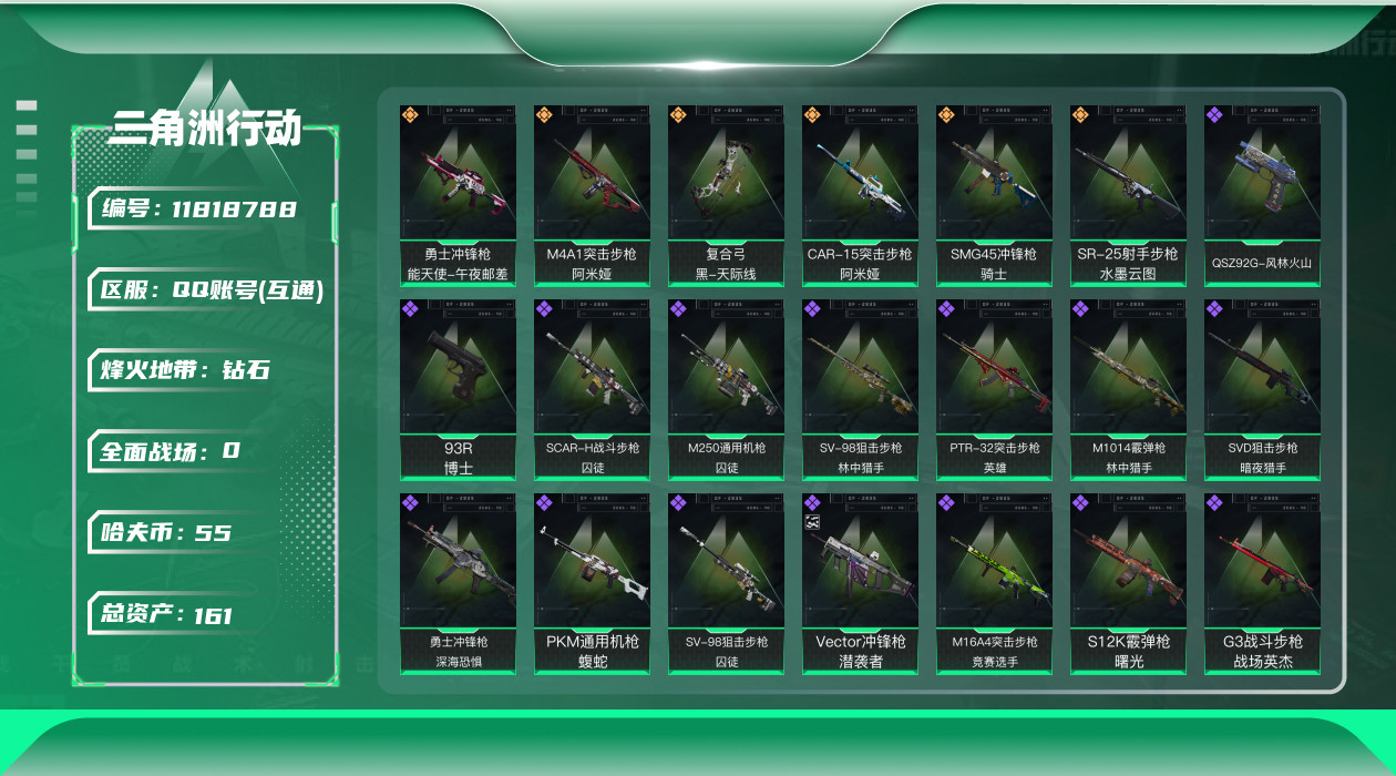[11818788]总资产:161.3M 6传说枪械 哈夫币:55.788K 可二次 可修改实名 优质装备:顶级安全箱(3x3) 烽火地带段位:钻石 全面战场段位:尉官 传说武器皮肤:SR-25射手步枪-水墨云图,SMG45冲锋枪-骑士,M4A1突击步枪-阿米娅,CAR-15突击步枪-阿米娅,复合弓-黑-天际线,勇士冲锋枪-能天使-午夜邮差 史诗武器皮肤:Vector冲锋枪-潜袭者,PKM通用机枪-蝮蛇,G3战斗步枪-战场英杰,SVD狙击步枪-暗夜猎手,M16A4突击步枪-竞赛选手,勇士冲锋枪-深海恐惧,M1014霰弹枪-林中猎手,SV-98狙击步枪-林中猎手,PTR-32突击步枪-英雄,M250通用机枪-囚徒,SV-98狙击步枪-囚徒,SCAR-H战斗步枪-囚徒,SVD狙击步枪-阿萨拉工艺,S12K霰弹枪-曙光,QSZ92G-风林火山,93R-博士