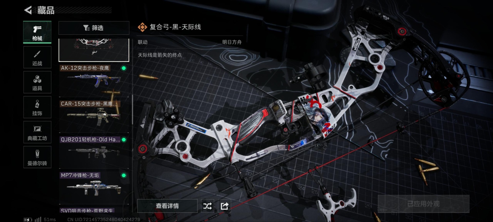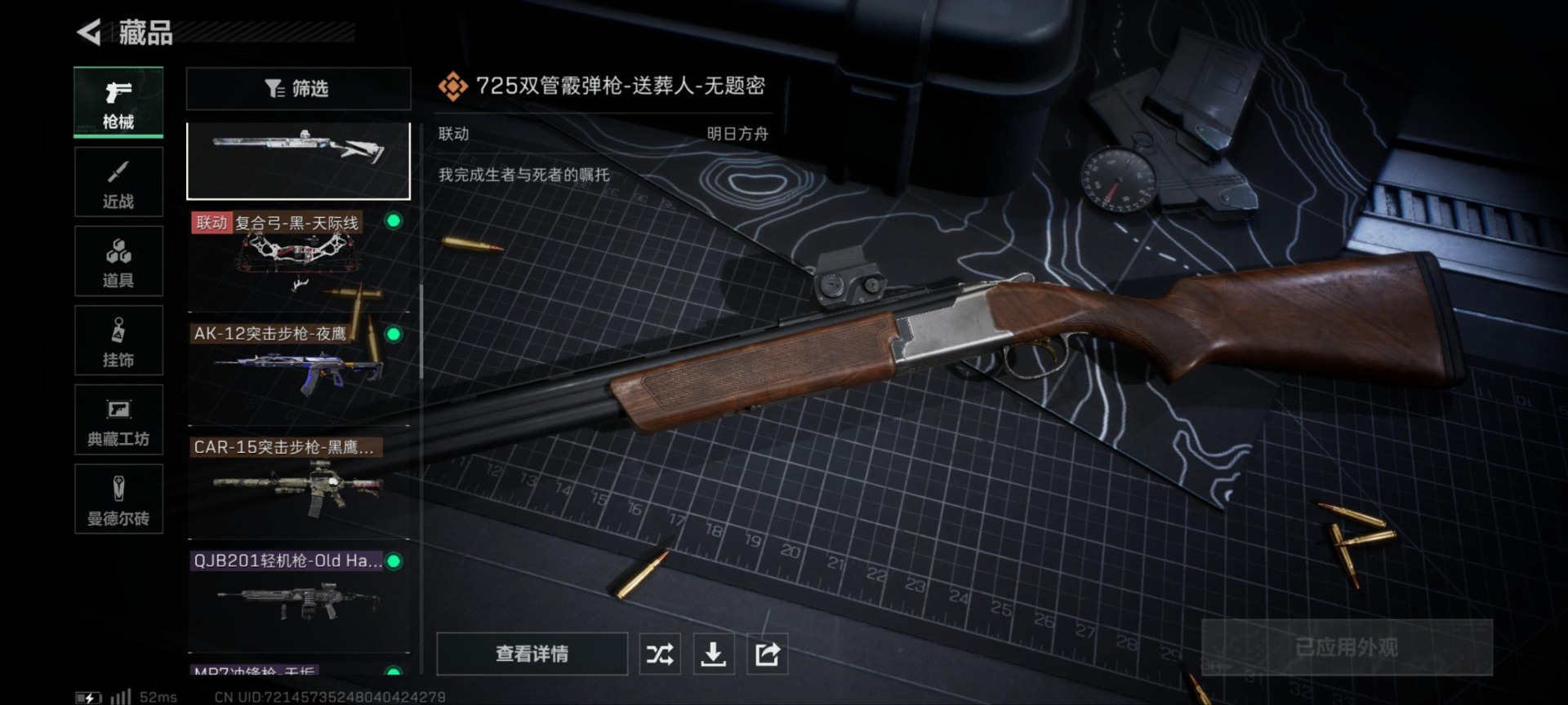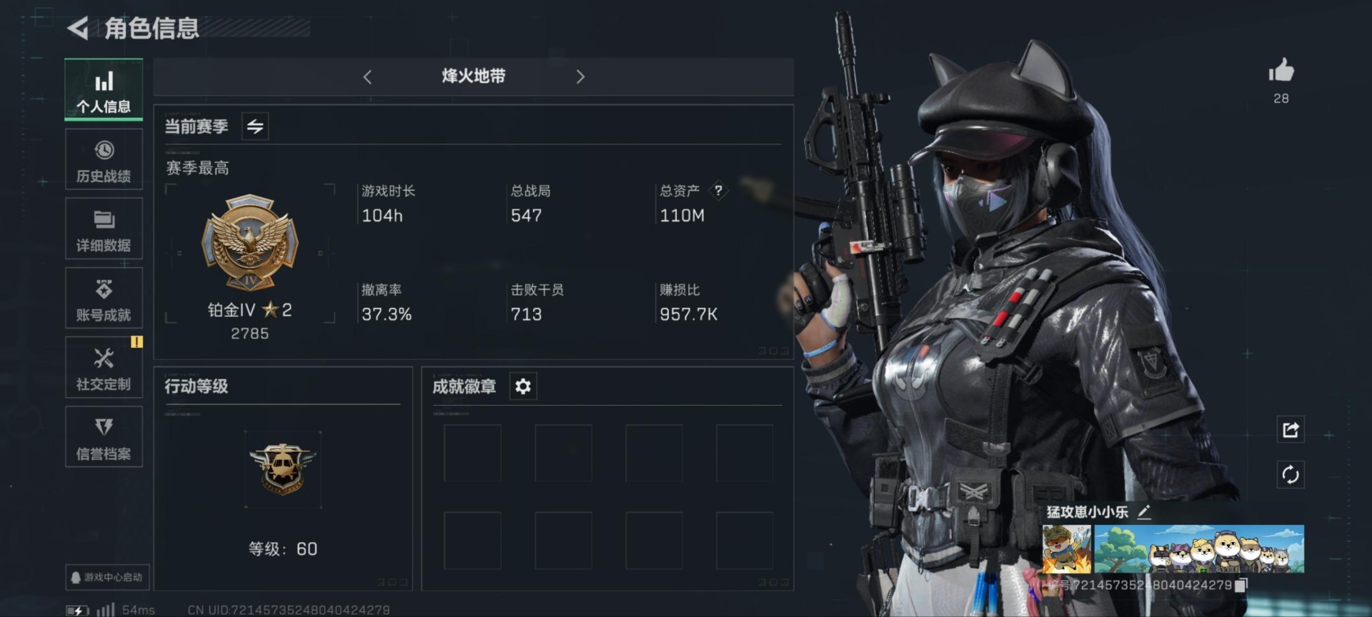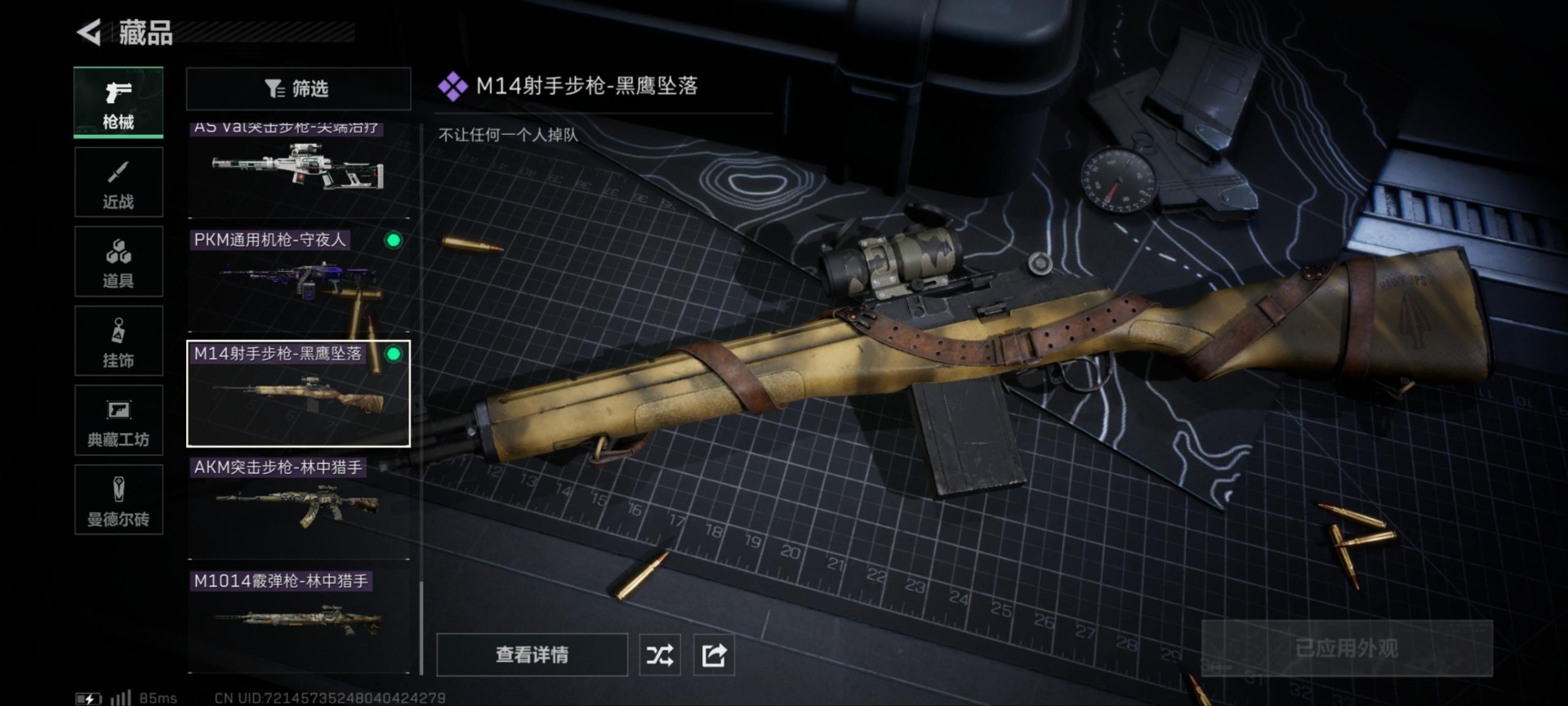 - [11679763]可二次 可修改实名 实名:可修改 顶级安全箱(9.17到期) 烽火地带段位:钻石 全面战场段位:无段位 总资产:186.1 哈夫币:3.402 传说武器皮肤:AK-12突击步枪-夜鹰,复合弓-黑-天际线,725双管霰弹枪-送葬人-无题密令 史诗武器皮肤:勇士冲锋枪-私人定制(典藏),SR-25射手步枪-尖端治疗,PKM通用机枪-荒野求生,AS Val突击步枪-尖端治疗,M700狙击步枪-守夜人,Ash-12战斗步枪-守夜人,SR-3M紧凑突击步枪-荒野求生,AKM突击步枪-林中猎手,M16A4突击步枪-竞赛选手,PKM通用机枪-守夜人,SVD狙击步枪-荒野求生,M1014霰弹枪-林中猎手,SV-98狙击步枪-林中猎手,PTR-32突击步枪-英雄,PSG-1射手步枪-无垢,M250通用机枪-囚徒,QBZ95-1突击步枪-曙光 干员外观:无名-夜鹰,露娜-黑·天际线