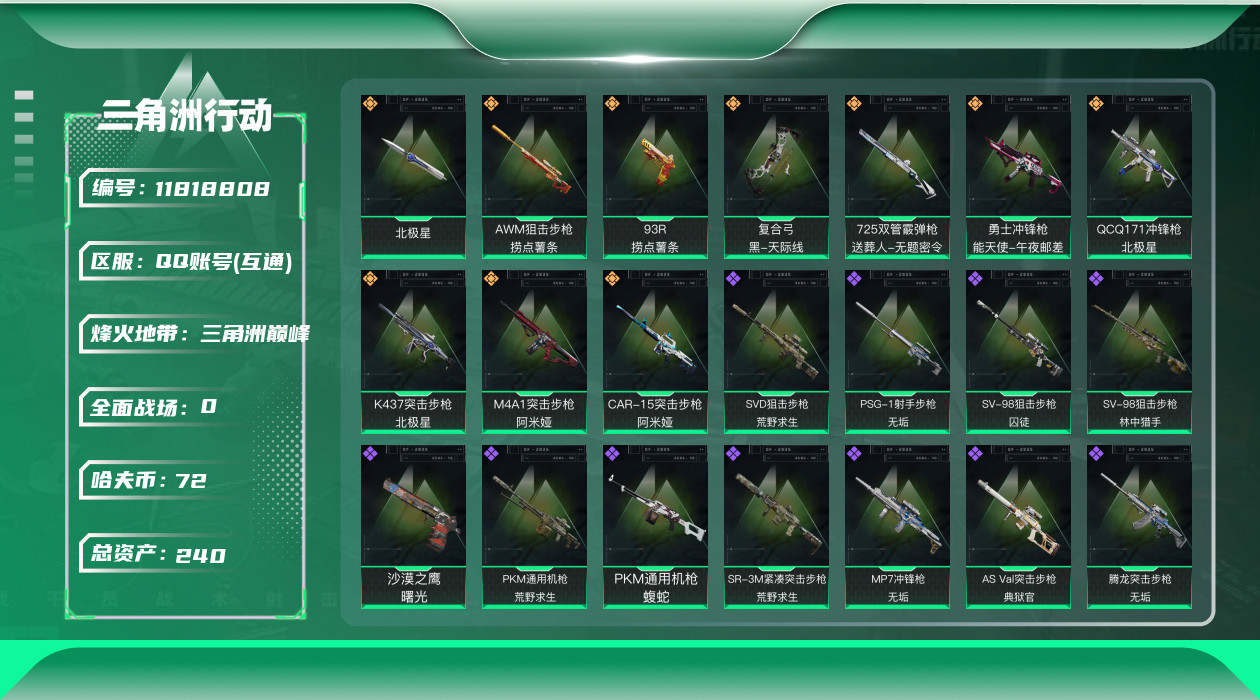 [11818808]总资产:240 1干员外观 1近战传说 10传说枪械 高级安全箱(9.17到期) 可二次 可修改实名 优质装备:近战-北极星 烽火地带段位:三角洲巅峰 全面战场段位:列兵 哈夫币:72.804 传说武器皮肤:QCQ171冲锋枪-北极星,93R-捞点薯条,AWM狙击步枪-捞点薯条,复合弓-黑-天际线,CAR-15突击步枪-阿米娅,M4A1突击步枪-阿米娅,725双管霰弹枪-送葬人-无题密令,K437突击步枪-北极星,勇士冲锋枪-能天使-午夜邮差 史诗武器皮肤:PKM通用机枪-蝮蛇,PKM通用机枪-荒野求生,SR-3M紧凑突击步枪-荒野求生,SG552突击步枪-深海恐惧,SVD狙击步枪-荒野求生,SV-98狙击步枪-林中猎手,PSG-1射手步枪-无垢,AS Val突击步枪-典狱官,SV-98狙击步枪-囚徒,腾龙突击步枪-无垢,MP7冲锋枪-无垢,沙漠之鹰-曙光 干员外观:蜂医-送葬人·无题密令(S5)