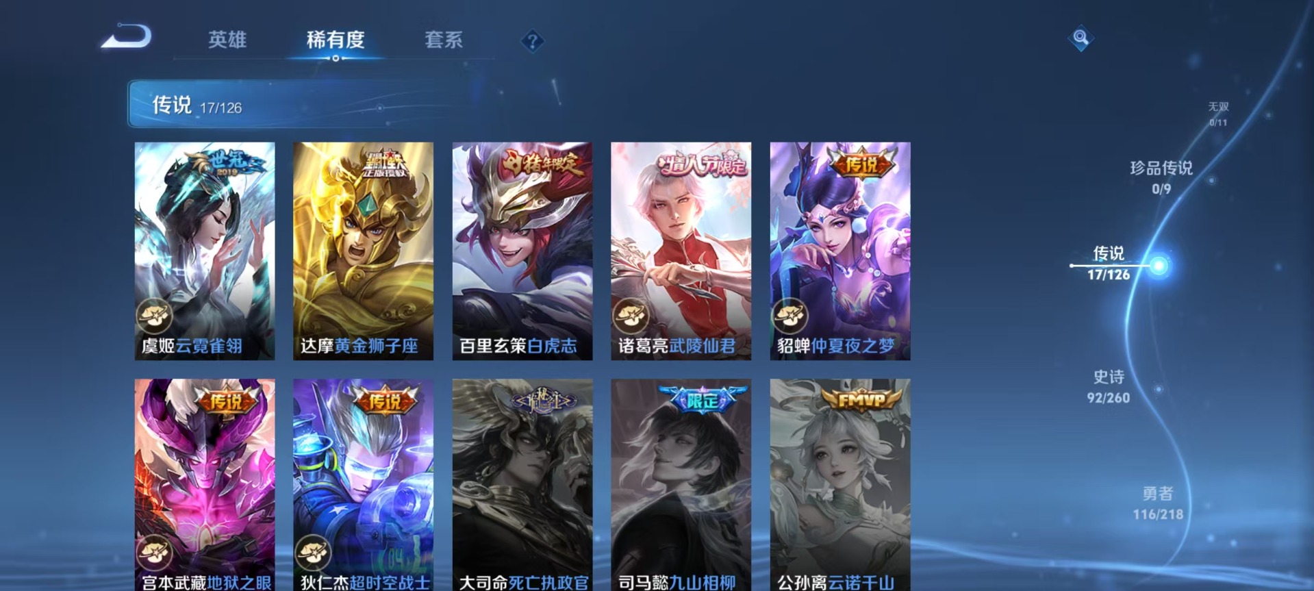 - PX_2106423-??信/至尊星耀/228皮肤/121英雄/1典藏/0珍品无双/0无双/0珍品传说/9传说/70史诗/7稀有英雄 【1 典藏皮肤】星域神启 诸葛亮, 【9 传说皮肤】白虎志 百里玄策,云鹰飞将 曜,深海之息 马可波罗,地狱之眼 宫本武藏,武陵仙君 诸葛亮,绛天战甲 铠,愿照·九州拓 澜,幻光神枪 云缨,愿照·山河定 司空震, 【70 史诗皮肤】乒乒小将 鲁班七号,电玩小子 鲁班